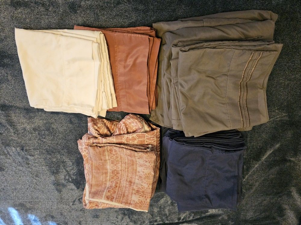 Blue set has four pillow cases. Grey set has four pillow cases. The pink print is a duvet cover and two pillow shams along with four pink pillow cases and four white pillow cases. Great for mixing and matching. Changed our bedroom colors to Tan and green instead.