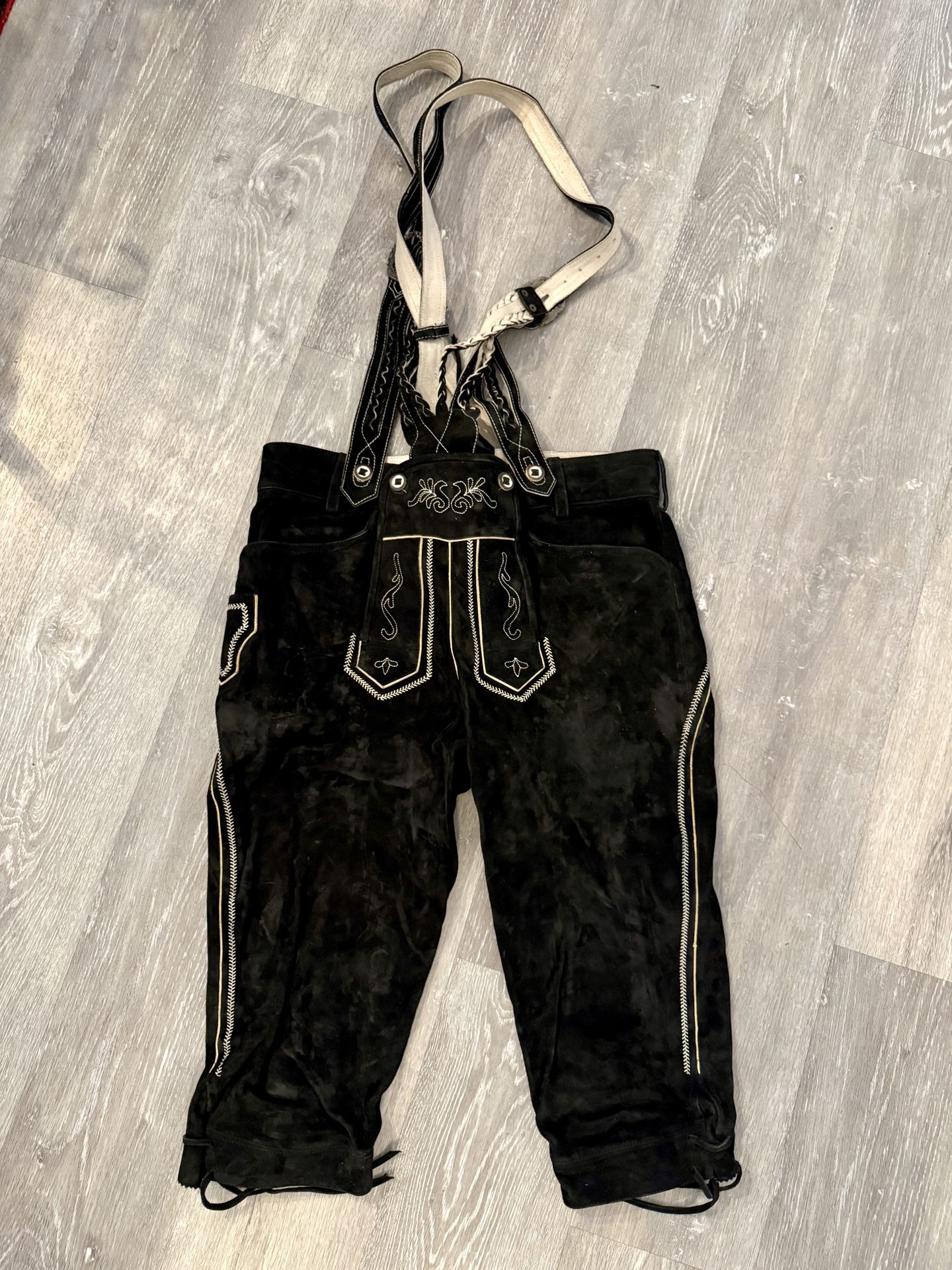 This is a pair of men's vintage German Leather Lederhosen (Black), size 34-ish. They were purchased in Munich, Germany. They are in great condition and ready for festivities! $75