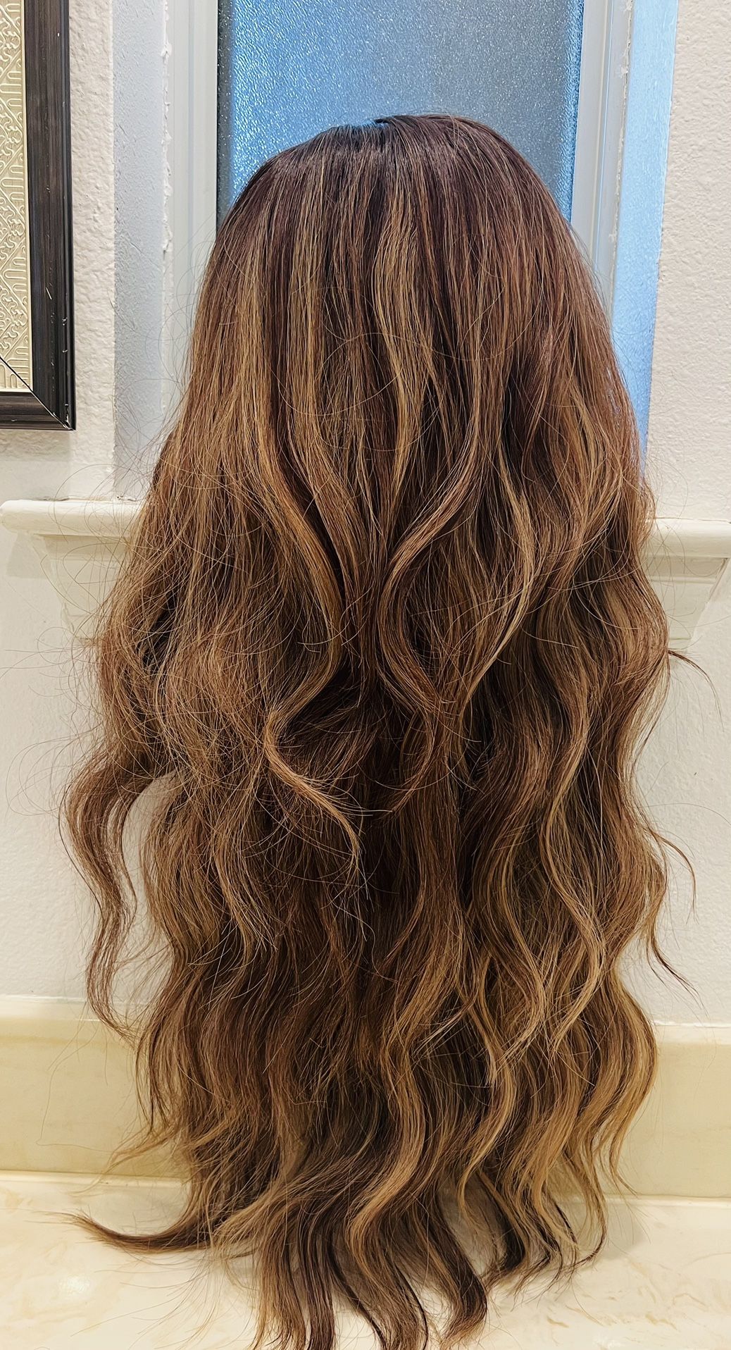 Beauty Forever Dark brown with caramel highlights and bangs long wavy curly hair,
