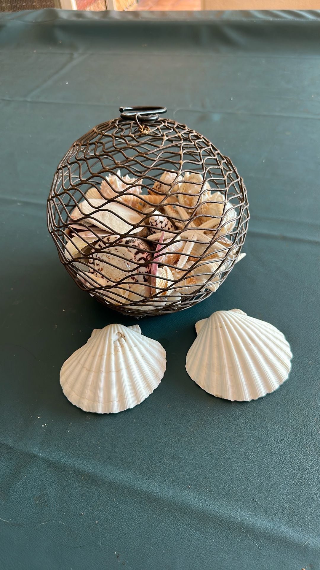 This round container has several seashells, all different shapes, and sizes