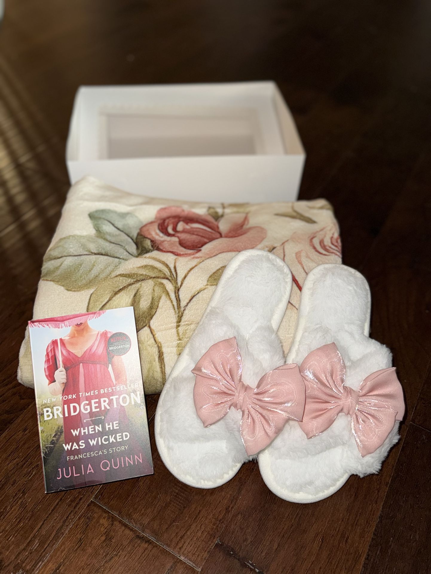 Women's Bridgerton Gift set includes: Fashionable Bowknot Women's Plush Slippers white with pink bows size 6.5-7 with an Open-Toe Design Bridgerton inspired Pink Rose Floral Flannel Blanket size is 80x 60 Soft, Warm & Cozy All-Season Throw for Couch, Machine Washable, Bridgerton paperback book All in a gift box ready to be given! Free gift with full list price purchase Cash & pick up in Cypress