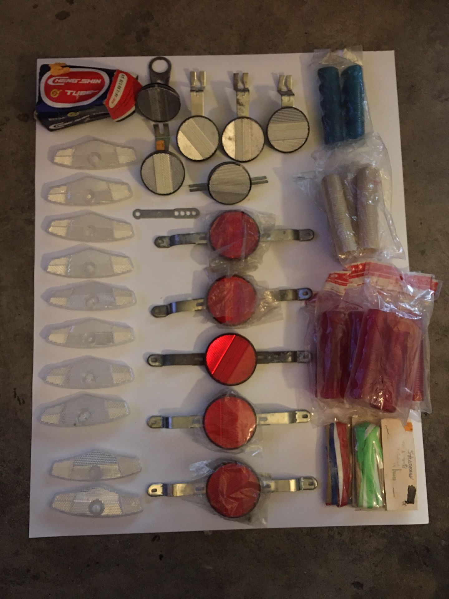 Location Valero 8402 Fairbanks N. Houston rd. at West rd. 77064 Reflectors, handle grips streamers, tube I think 14” Has some wear from being stored for many years in garage. I think seem to be in good condition Best I can describe. Sold as a bundle of 34 pieces not sold separate