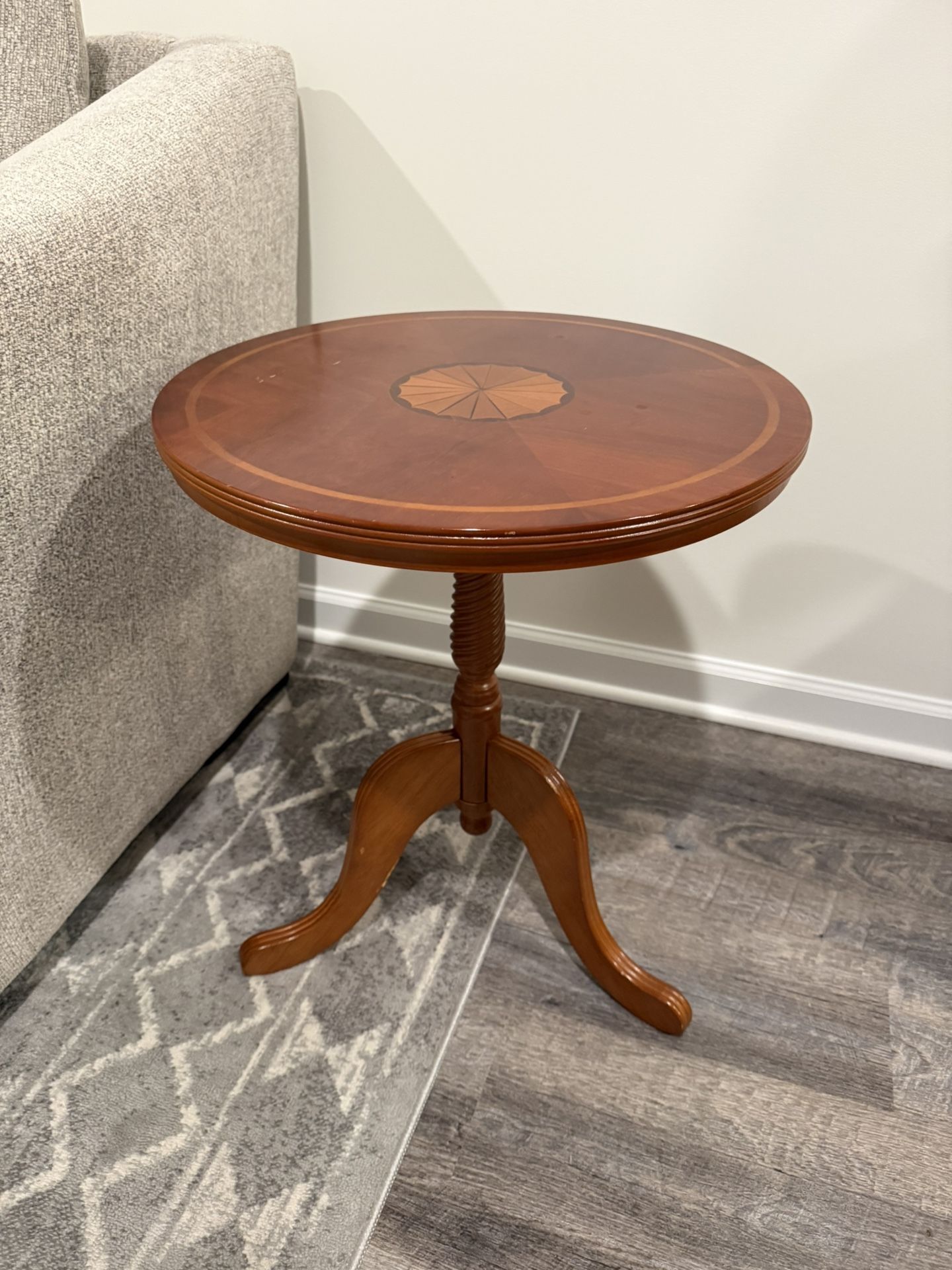 Beautiful table!! Has some scratches on the surface but they can either be touched up or covered with lamp/decor. 19” diameter x 23 H Public meet near Flowers area Clayton.