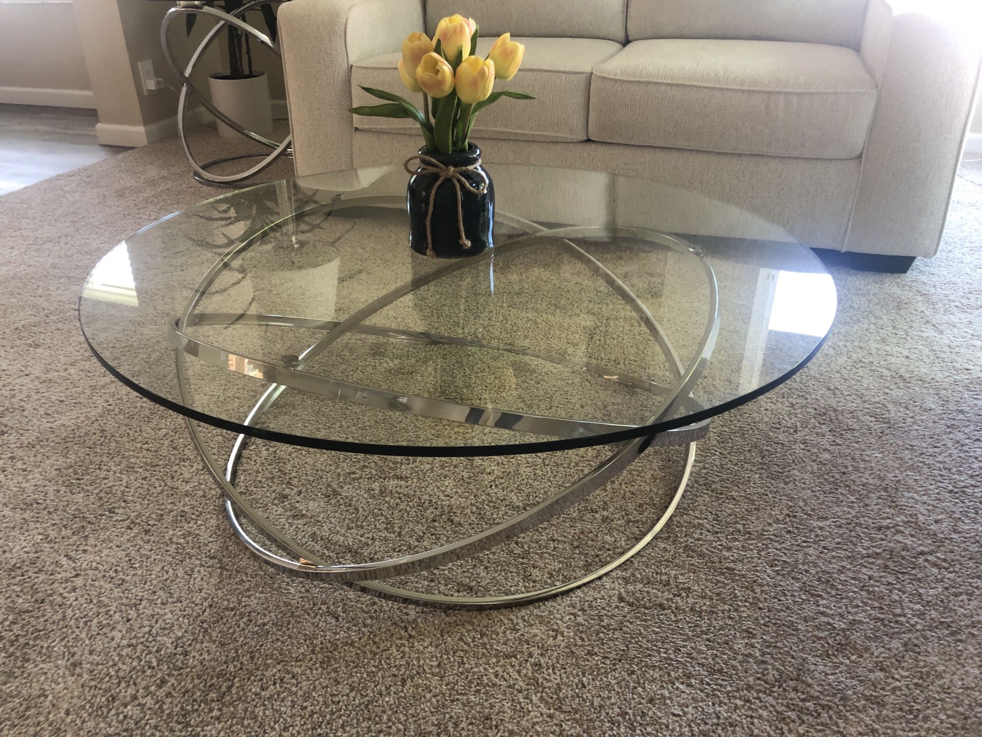 Originally $1000+ from King’s Road. selling for $300 for the set. Coffee table is 41” round x 14” tall, heavy glass on metal frame. Side tables are 26” round x 24” tall.