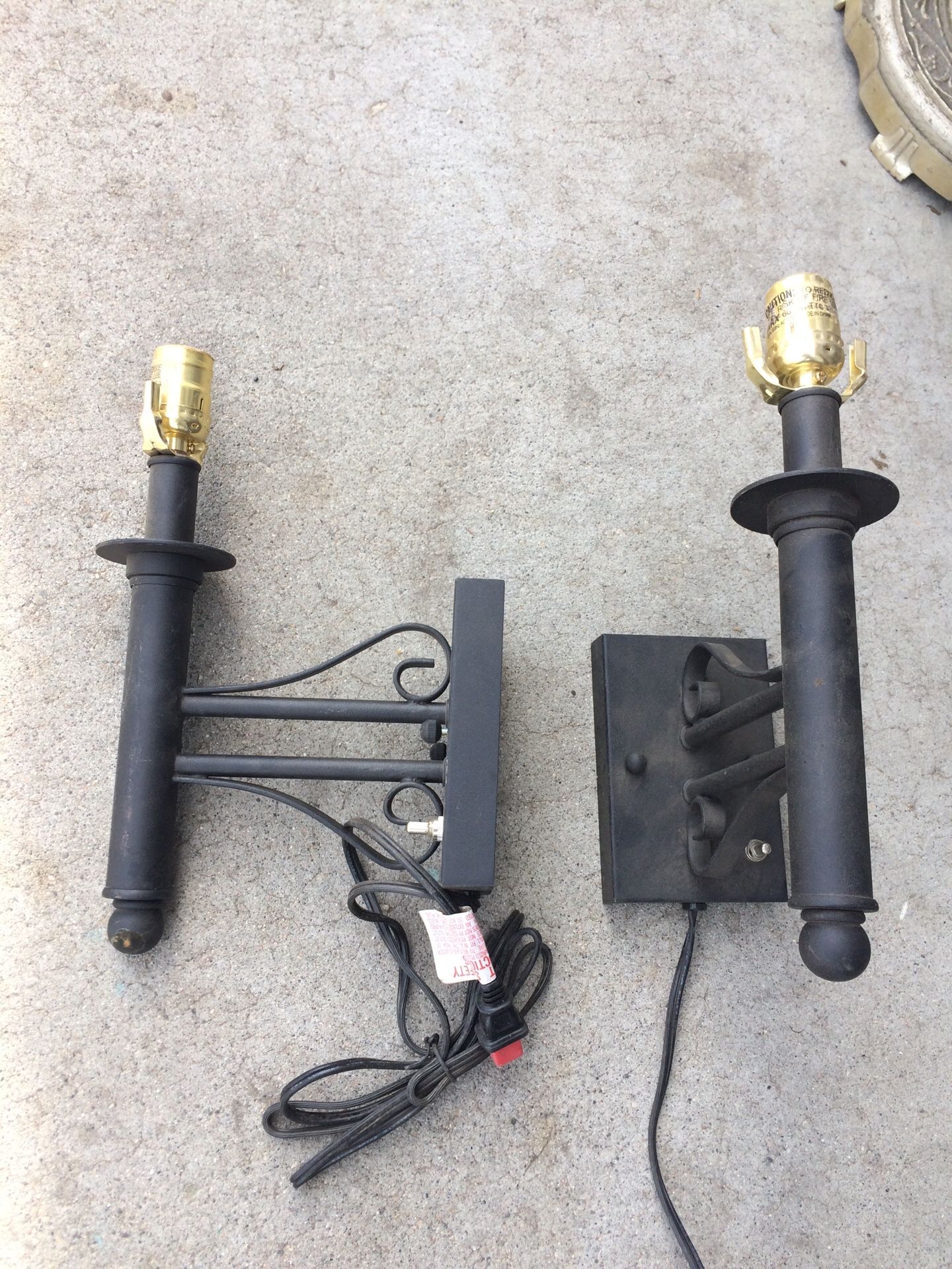 Set of two indoor wrought iron wall lighting, except a small lamp shade. Price each.