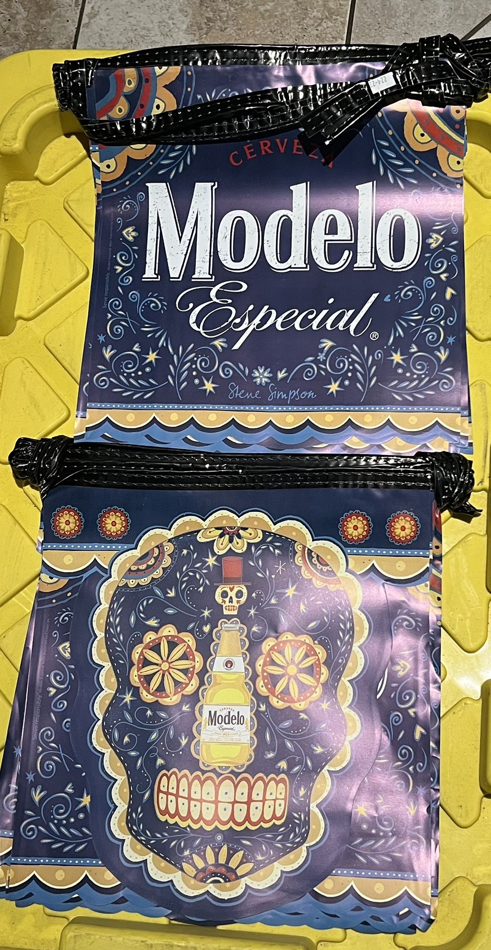 10 x 18 Foot Restaurant Banner Decor Modelo Especial Dia De Los Muertos 1)Each banner has 18 x 12 inch Modelo Especial Dia De Los Muertos decor stringed together 2)One side is Modelo Especial. The other side has Dia De Los Muertos decor 3)We have 10 banners that are 18 feet long