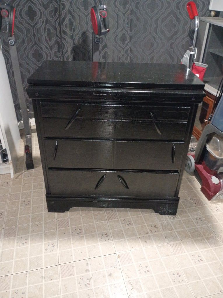 Glossy black 3 drawer dresser freshly painted and lacquered,real sturdy wood,drawers open and close smoothly with the handles put on in a cool variety of different ways.. 33 x 17 1/2 x 33