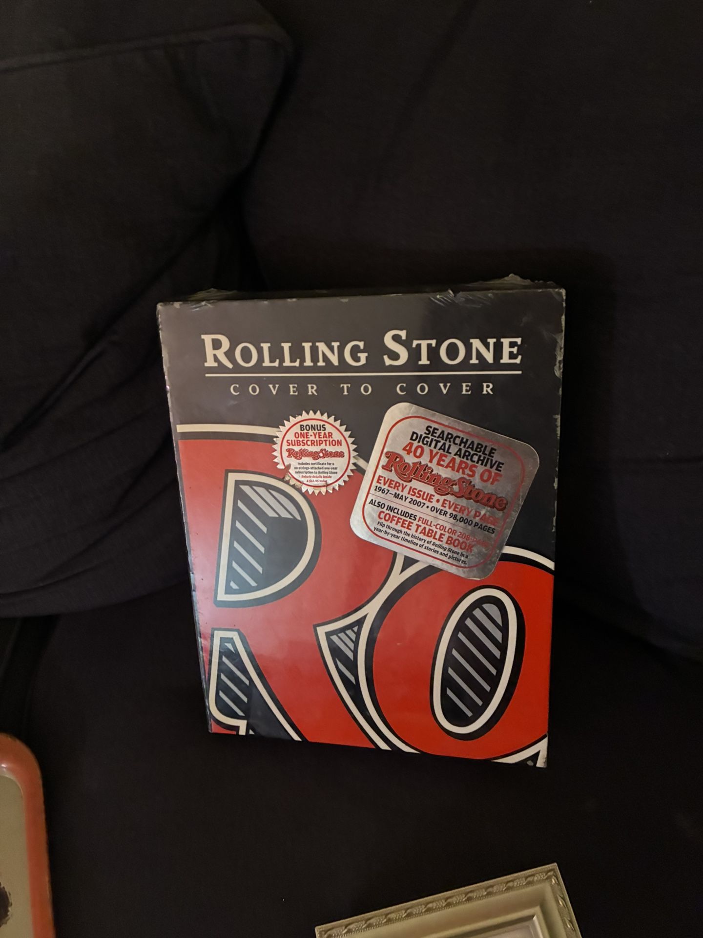 The image shows a "Rolling Stone Cover to Cover" box set, which is a searchable digital archive of the magazine's first 40 years. It contains every issue and page from 1967 to May 2007. The archive comprises over 98,000 pages. The set also includes a full-color 208-page coffee table book. CLEAR SEAL NEVER OPENED