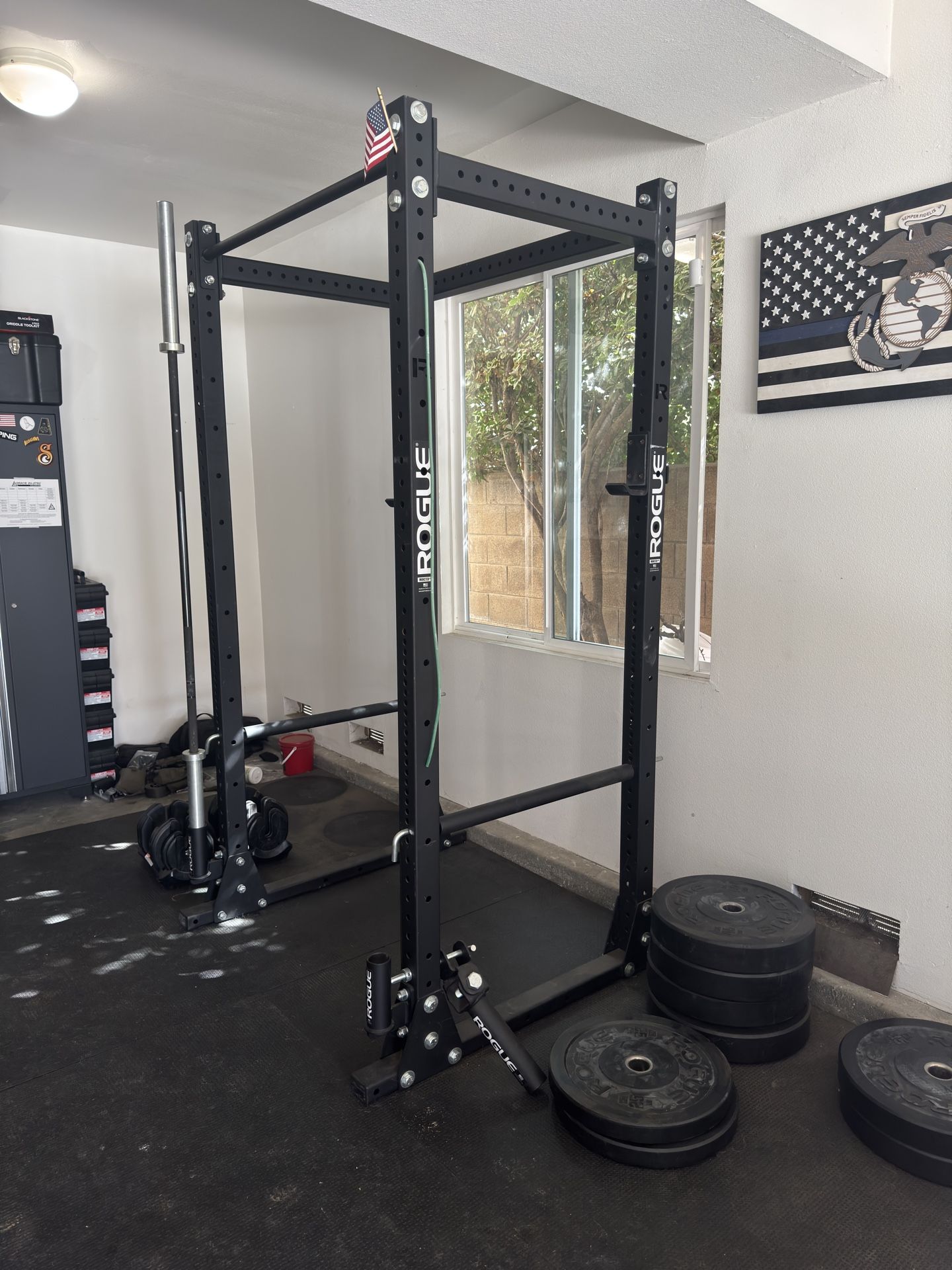 (1) RML-390F FLAT FOOT MONSTER LITE RACK (1) ROGUE OHIO BAR (2) ROGUE BARBELL HOLDER attachments (1) ROGUE LANDMINE attachment (2) 10LB, (2) 25LB, (2) 35LB, and (4) 45LB bumper plates. (1) EZ CURL BAR (generic brand) (4) 6x4 Horse Stable Mats (2) ROGUE barbell collars (2) spring collars (generic brand)