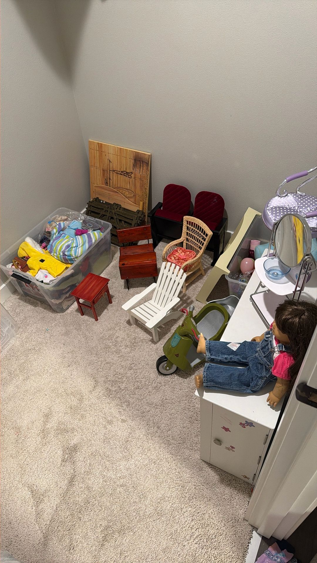 Over 60 outfits Horse stable vintage samantha doll Scooter Theater seats Closer with murphy bed Hair salon chair Sink with mirror. Multiple shoes Hats Gardening stuff Electric guitar Etc…