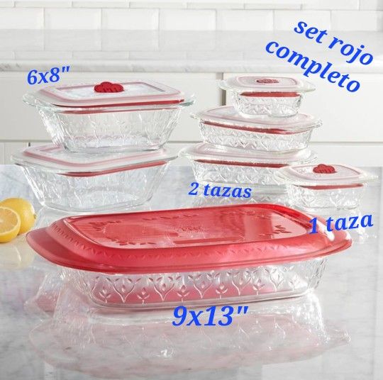 Contenedores con Tapas rojas ❤️2- 1 taza ❤️2-2 tazas ❤️2 -6x8 ❤️1 -9x13 Must sold all together Include: 2 ) 1 cup container w/ lid 2) 2 cup container w/lid 2) 6x8" container w/lid 1) 9x13" container w/lid Pick up only Recipientes