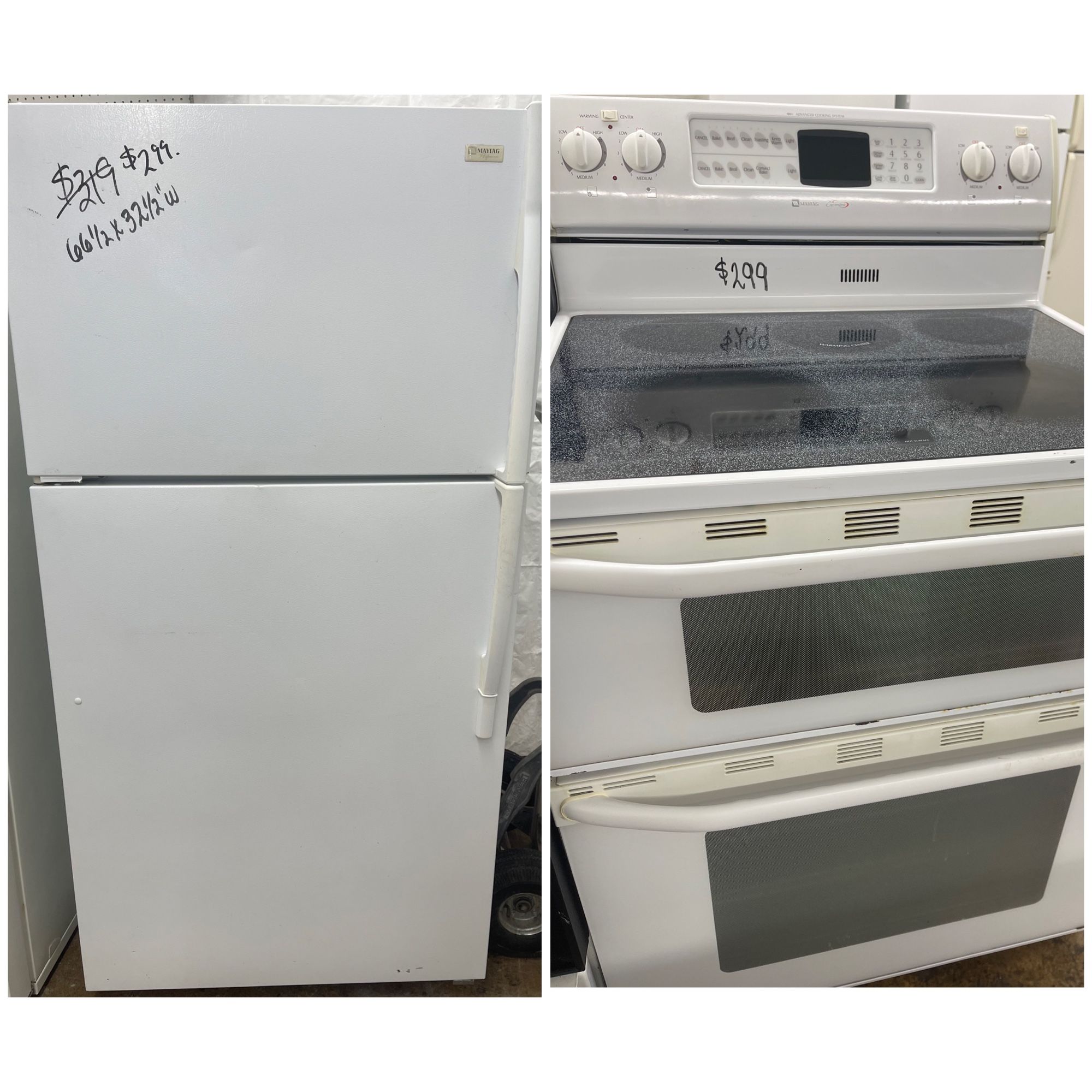 Maytag Refrigerator and Stove Save $$$ and Buy Pair for $559 Maytag White Refrigerator 67.25” H x 33” W x 29” D (with Doors but no handles) 21 Cubic Feet $299 for Refrigerator Maytag White Electric Stove Range Timer Self Cleaning Convection Oven/Air Fryer in Large Oven! Double Ovens = 2 Ovens! An Extra Large Oven and Pizza/Bread/Sides Oven $299 Save $$$ and Buy Pair for $559 NOW ACCEPTING AFTER PAY in addition to Acima! Split your total into 4 equal installments! $$$ Take Home Any Appliance with as little as $53 Down with No Credit Needed Financing! Text 67587 to 22462 to Acima to Apply Now! $$$$ *** 30-Day Warranty in writing covers EVERYTHING 100% *** Delivery is $60 for Dayton includes Installation and Removal of the Old Machines Buy Rite Appliance 2327 E Third St Dayton Oh 45403 Office: (contact info removed) Text: (contact info removed) Open Monday through Saturday 10 AM - 6 PM