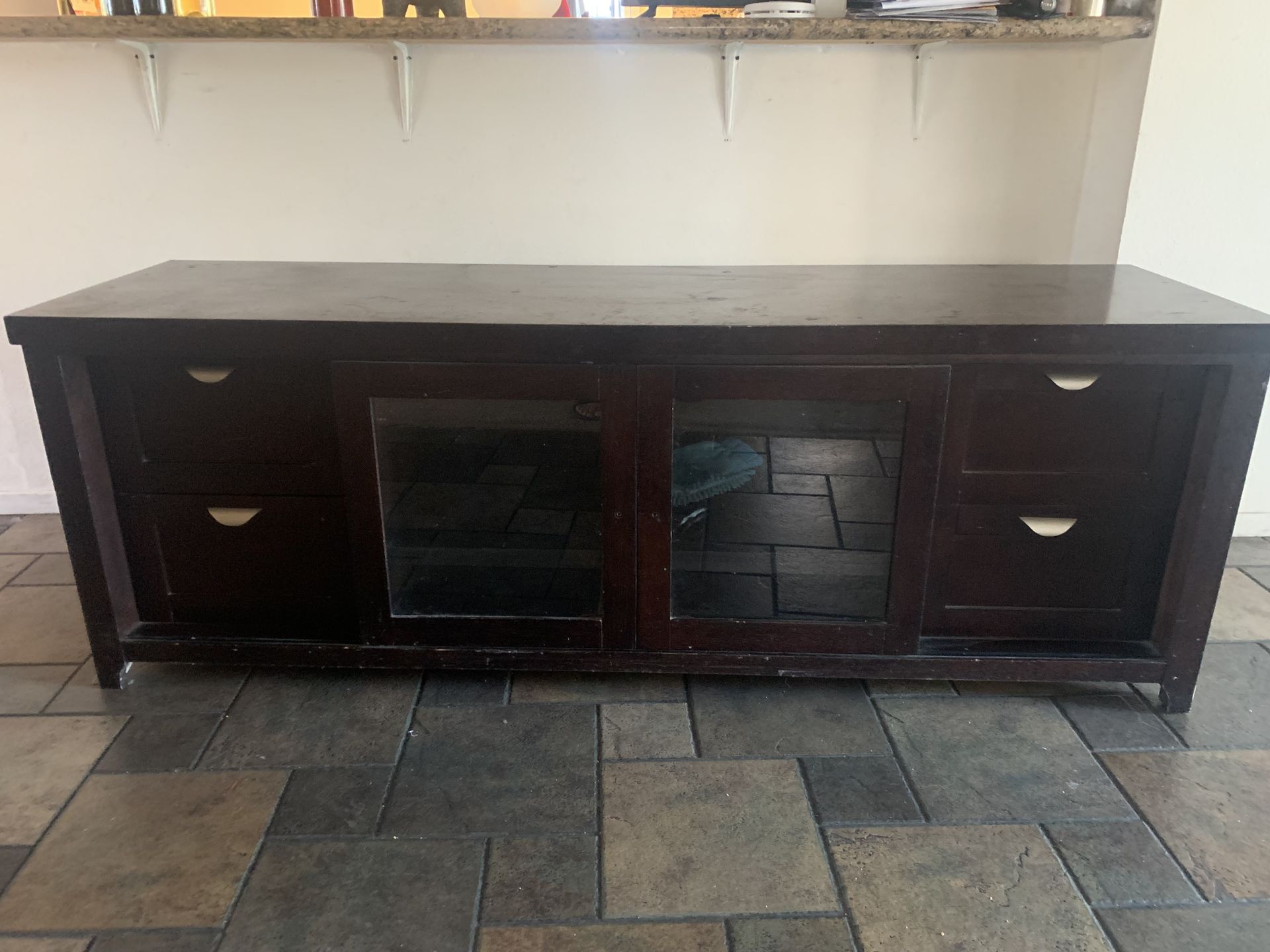 TV Stand SOLID WOOD/ not particle board Sliding central panel. 4 Storage drawers All drawers work. Holds up to a 100 inch TV Normal wear and tear. Asking $30 or best offer. L 72 x D 20 x H 25