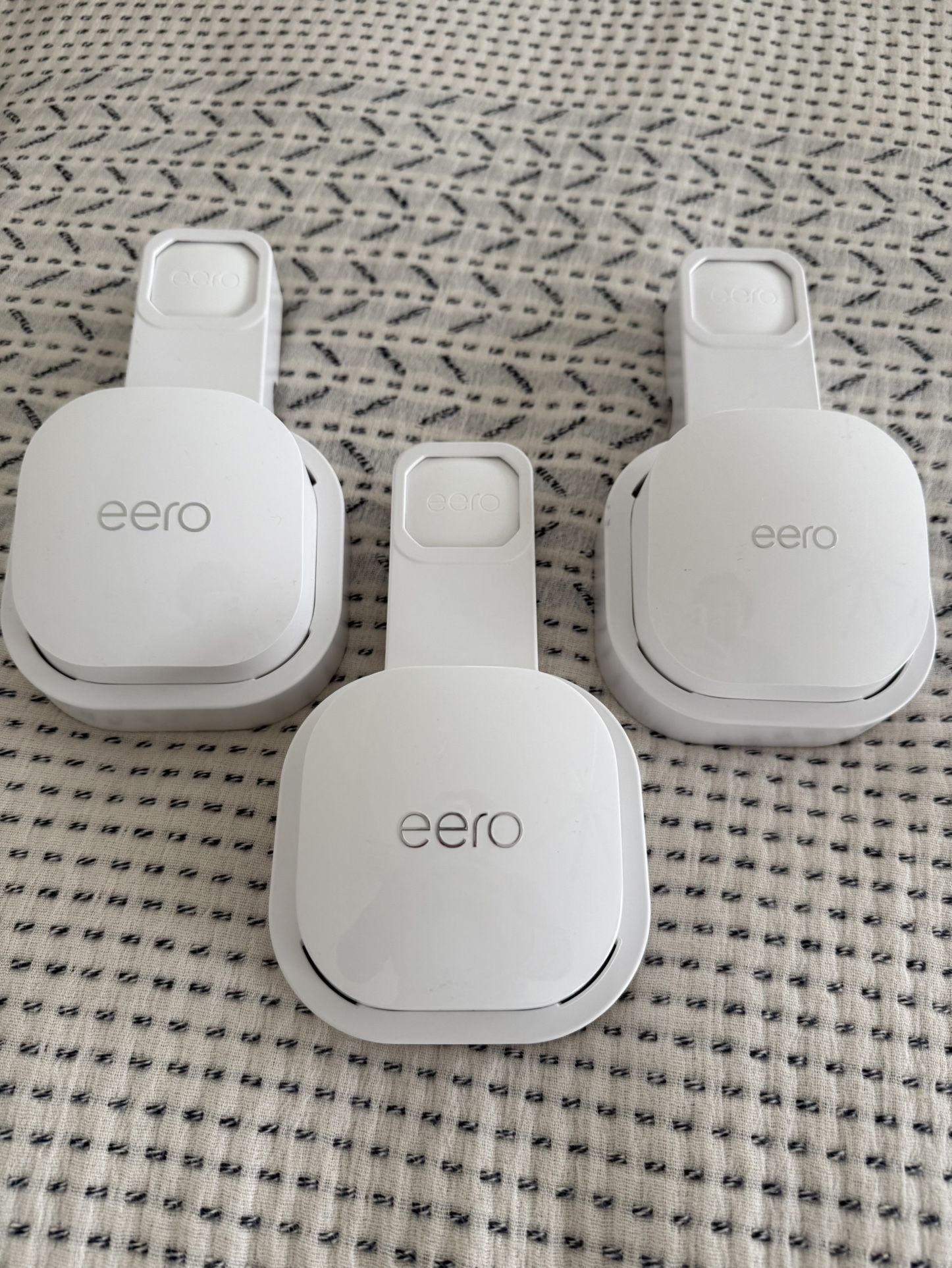 2 WiFi systems or 1 WiFi system your choice. 1 eero 6+ router & 2 eero 6+ extenders. 1 eero 6 router and 3 eero 6 extenders. 6 Wall outlet mount holders. All power cables included. Excellent condition.easy setup.