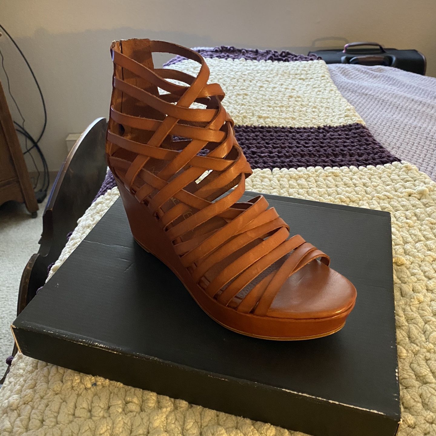 Brand new in box never worn beautiful leather sandals from Spain . Back of heel zipper .