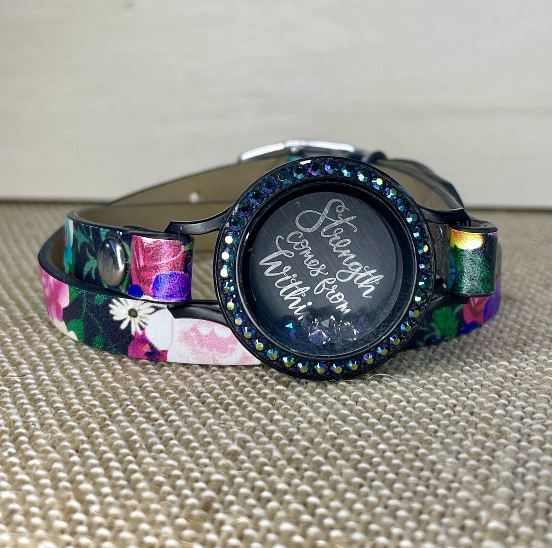 - Locket size medium - “Strength comes from Within” plate - Small Swarovski Crystal Charms