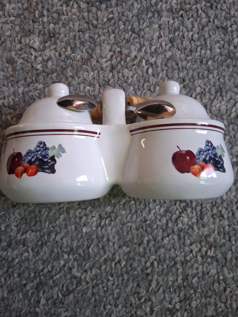 Still in the wrap never been used classic ceramic jelly server or can be used for sugar and cream. A nice decoration for any kitchen or table.