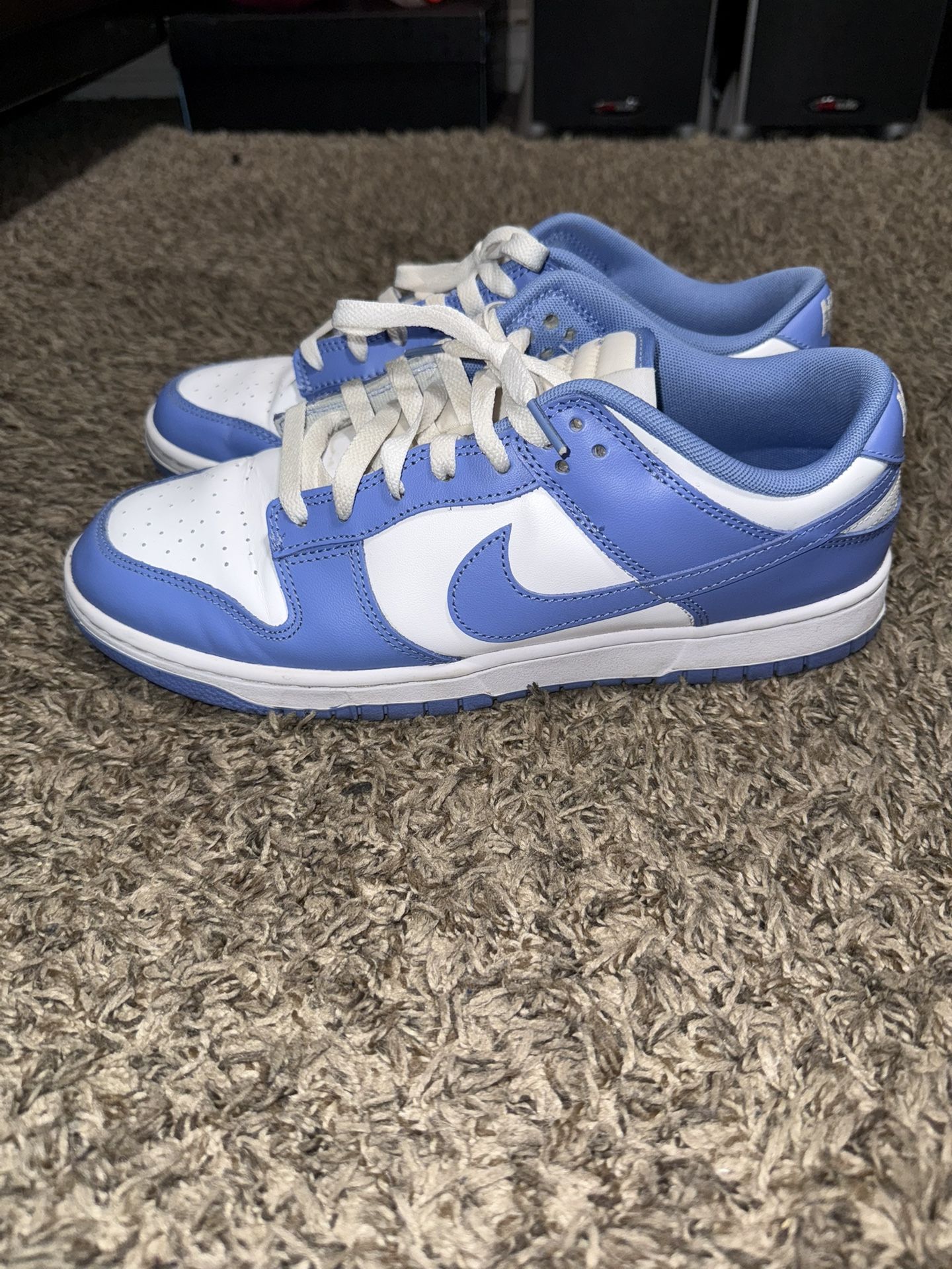 I am selling a used pair of the Nike Dunk Low “Polar Blue” in a size 10.5 us. Only worn a few times, they no longer fit. Light scuff marks on the upper on both shoes. No box included.
