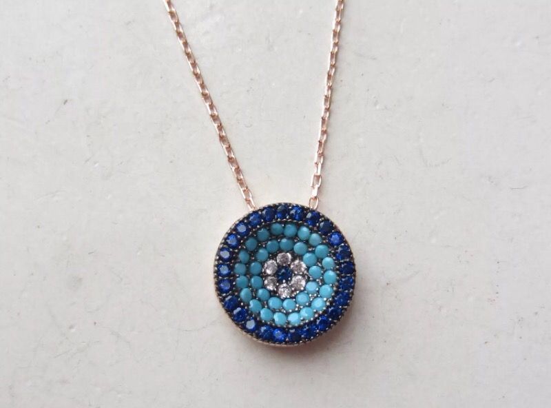 925 Sterling Silver, Handmade Rose Gold PLT, Evil Eye Sapphire Turquoise GOOD LUCK Necklace