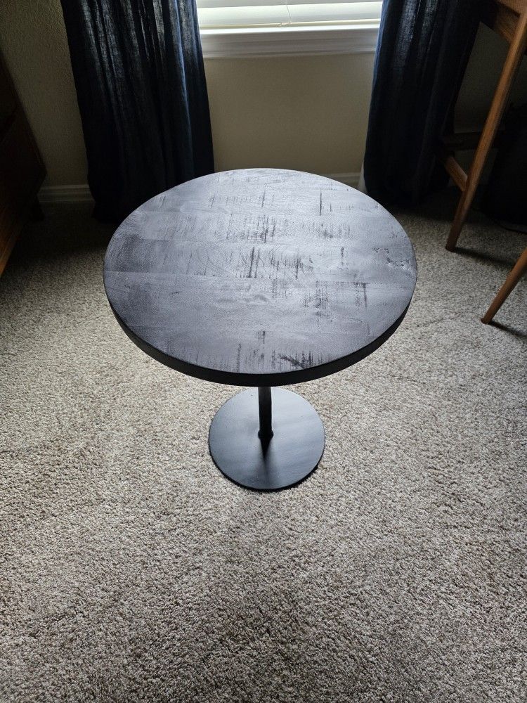 Distressed wood top and metal base.