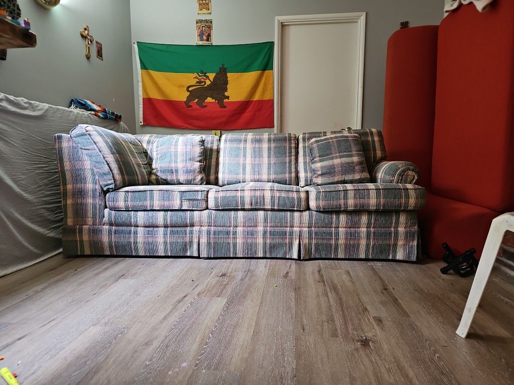 The sofa was barely used and is for sale. Its A Greenish Colorand Has 2 Pillows.