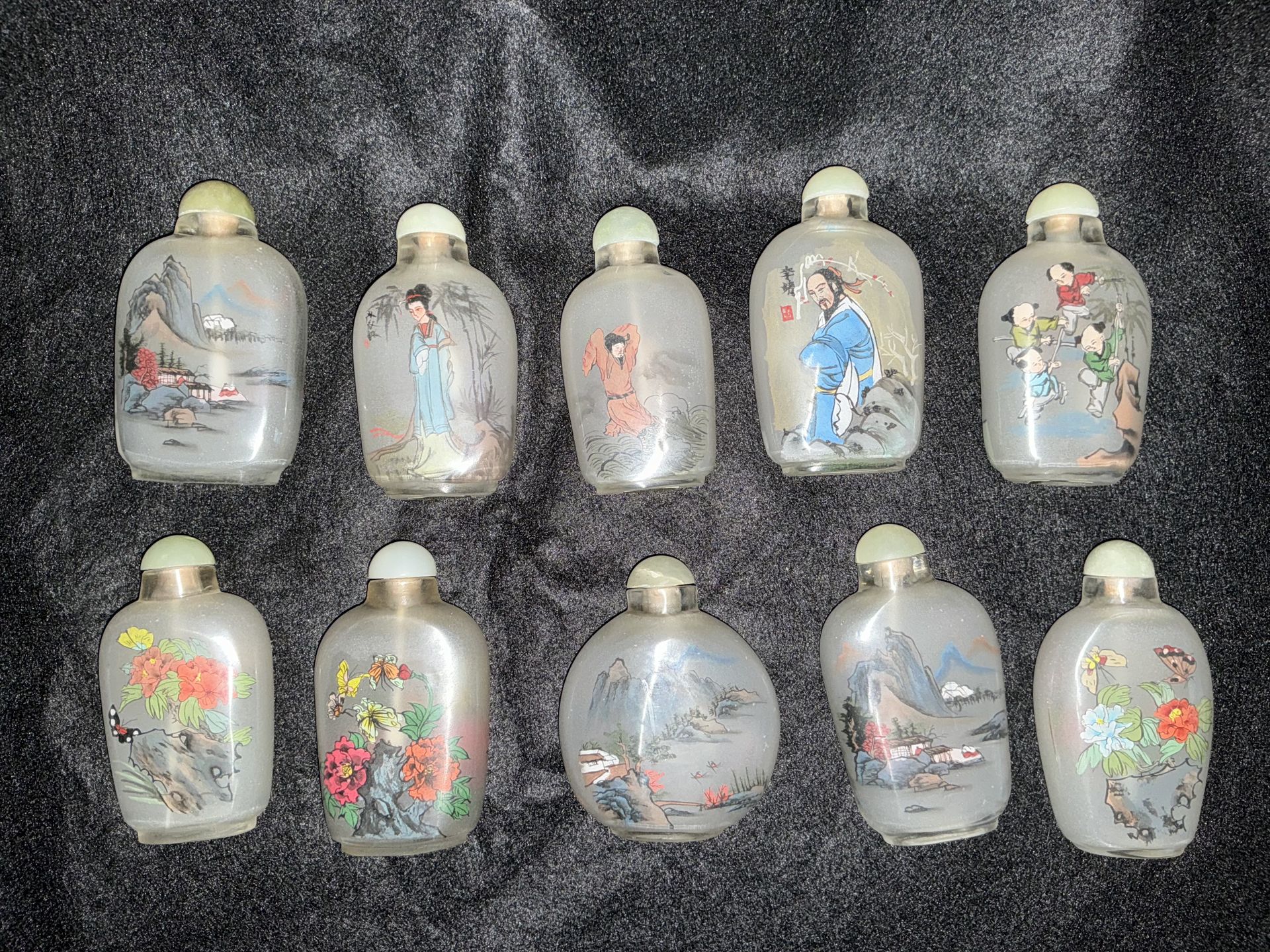 This is for all 10. These are Chinese reverse painted glass snuff bottles. An exquisite traditional craftsmanship. Delicately hand painted from the inside of the glass. The reverse painting technique requires exceptional skill and precision, as each detail is applied in reverse order through the bottle's small opening. Height: approximately 5 inches Width: approximately 3 inches