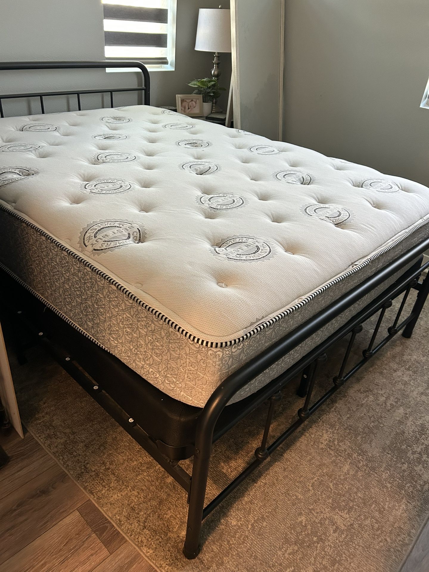 Queen Mattress 10 years load but only used for guest bedroom for 8 of those years Box spring is 3 years old Frame- black. Metal. 3 years old