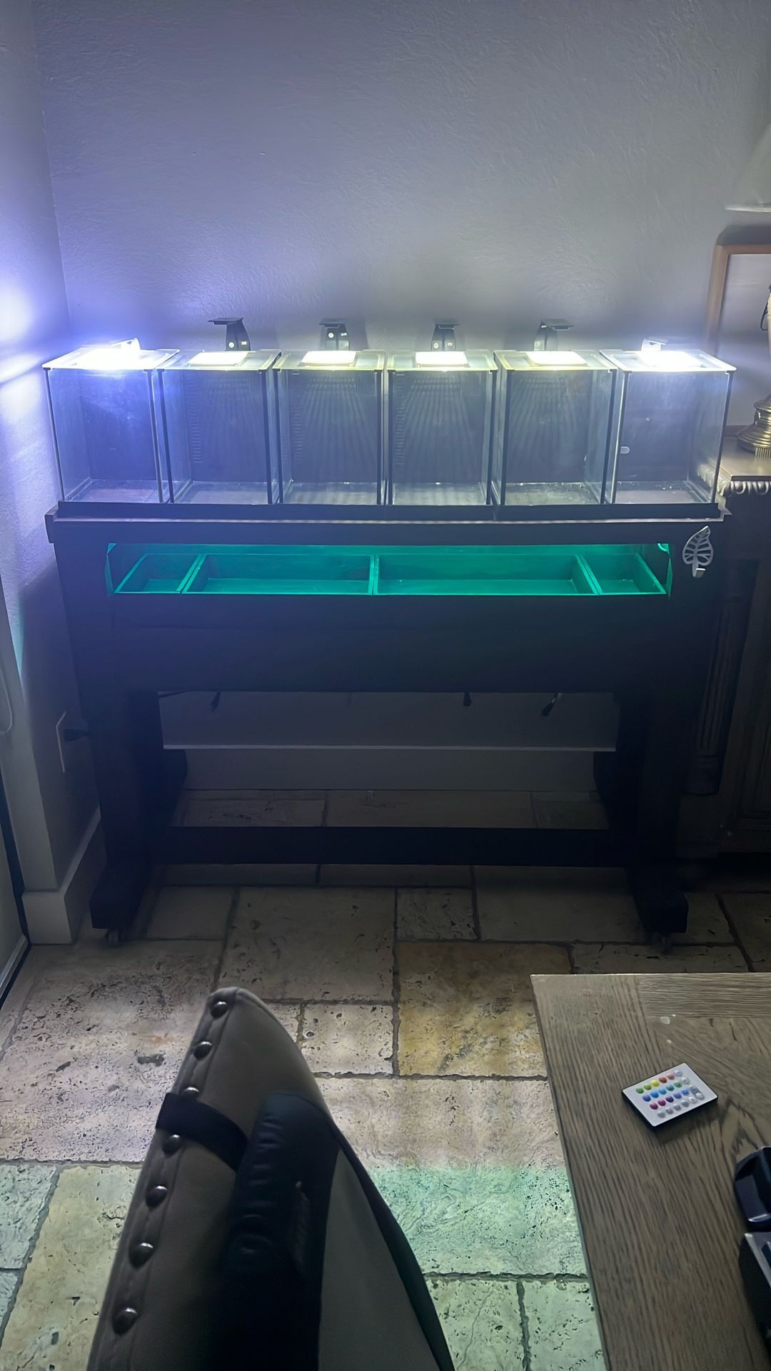 Each aquarium has an LED light, clear lid cover with center lid separated, filter with bio/sponge. Five white walls for privacy that can be removed. No leaks like new. Customized wood stand stained brown with four wheels with locks, Includes 20 outlets in the back. Also includes lights inside stand over the 4 shelves. Shelves slide in and out. Each shelf has a modern handle if you want to use. Lights have a remote control which changes color and does more. On top I have a customized rack incase a long LED light will be used or both racks can be removed. $1,000 was spend on this unit. This display is perfect for bettas, nano tank, shrimp, landscapes, breeding and more. If you need it delivered and/or installed for a fee just ask or pick up by 216st sw 129ave. Everything works no damages.