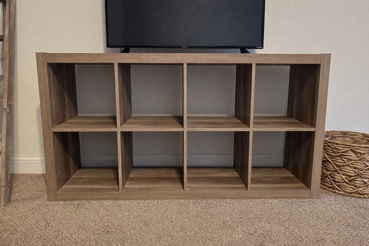 Modern wooden TV stand with six open storage cubbies. Sturdy, clean, and in great condition with no damage. Perfect for a living room, bedroom, or apartment setup. Works well for TVs, books, baskets, décor, or media storage. Neutral wood tone matches most styles. TV not included. Pickup only.