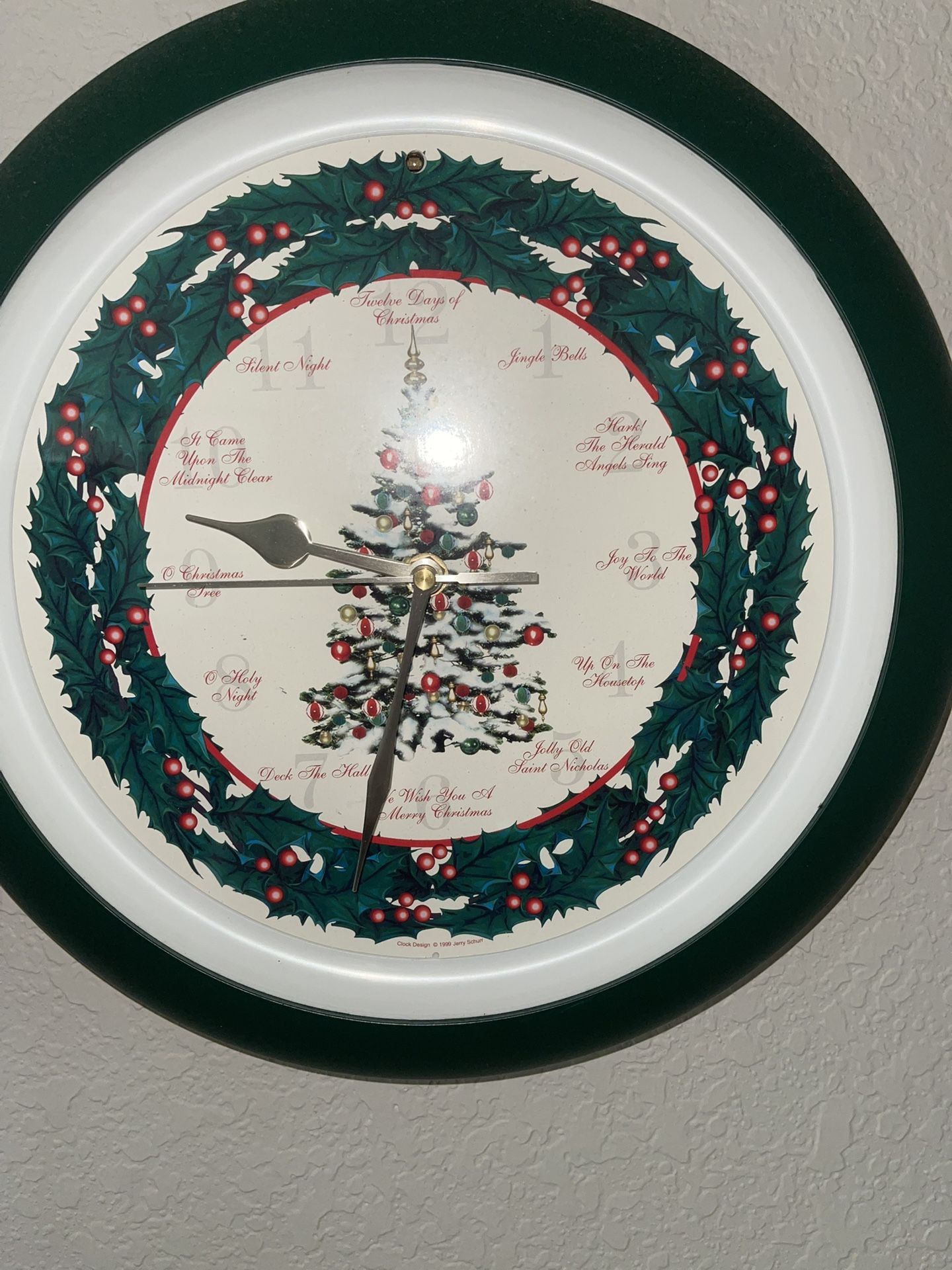 VINTAGE MUSICAL CHRISTMAS TREE WREATH WALL CLOCK WITH 12 SONGS. THE CLOCK PLAY A DIFFERENT SONG AT EACH HOUR. IN GOOD WORKING CONDITION