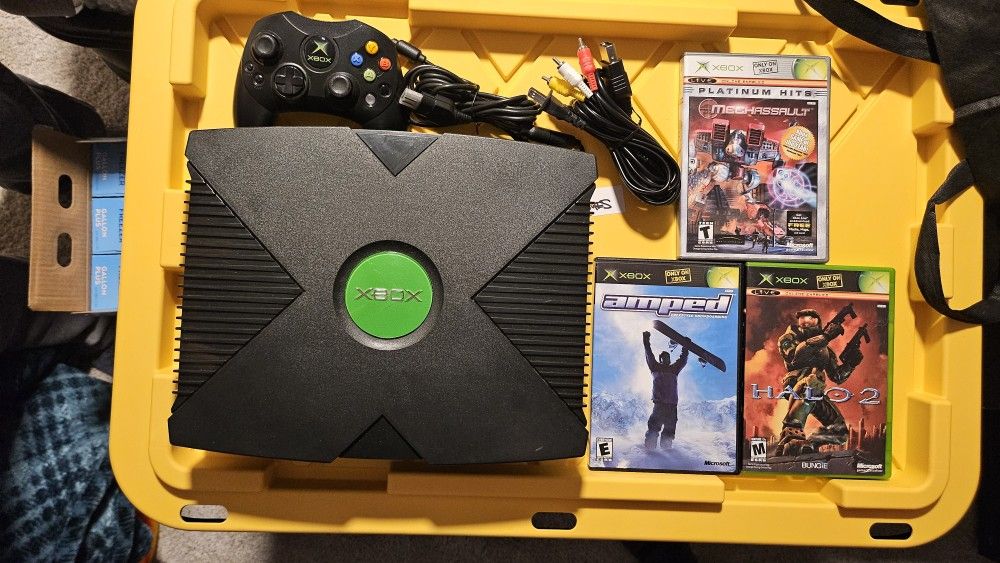 Original Xbox console with one controller, av cable, power cable, and three games (Halo 2, Mech Assault, Amped). Tested, works.