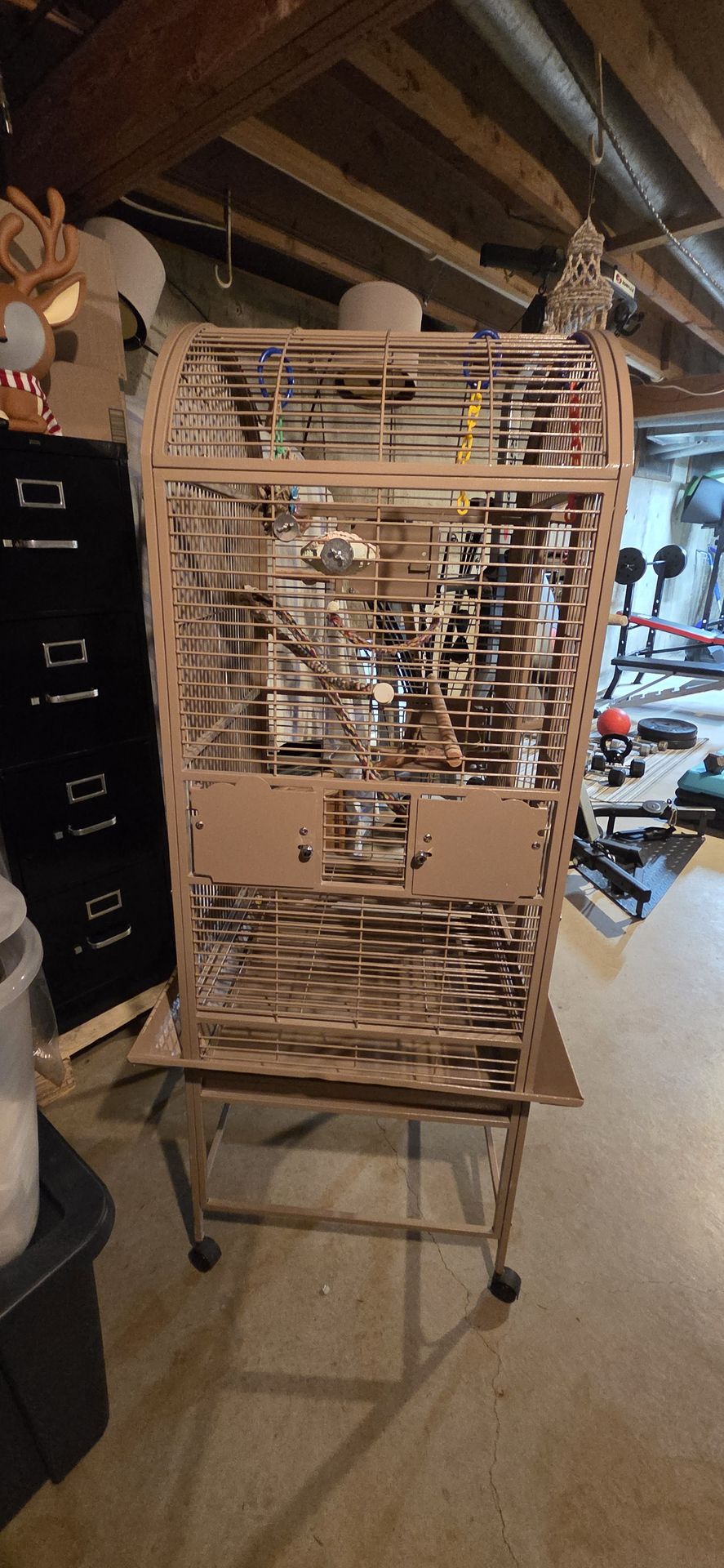 Missing a wheel..broke off when bringing it in basement comes with hanging toys and food bowls..pretty good condition didn't use for long