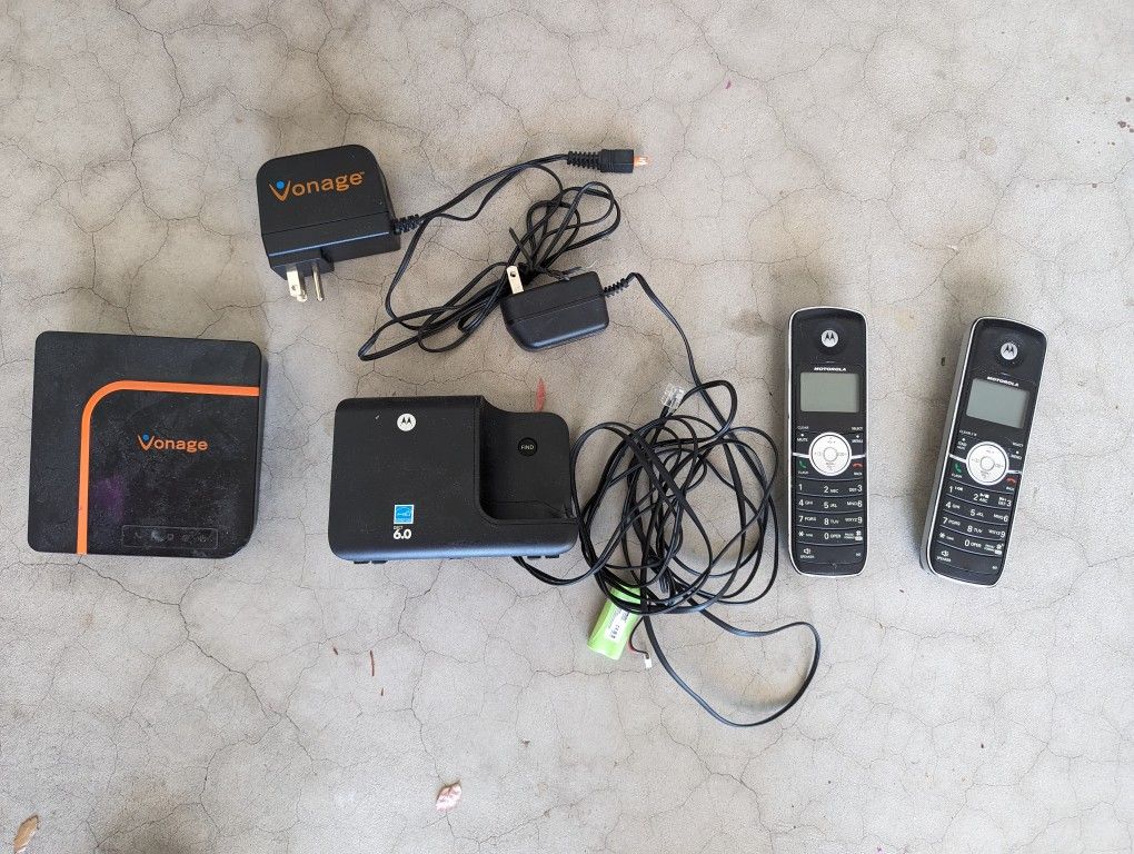 Vonage phone with 2 headsets, holder and cable accessories, charger.. Used but good working conditions