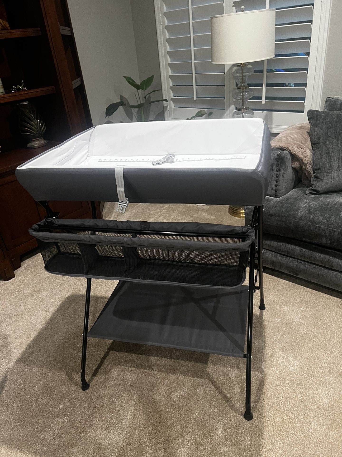 diaper changing table. used once with a mat and then started using crib changing table instead. pulls apart to be small for storage. taller in height so you don’t have to hunch over to change diapers. has great storage on the sides as well as a shelf on the bottom.