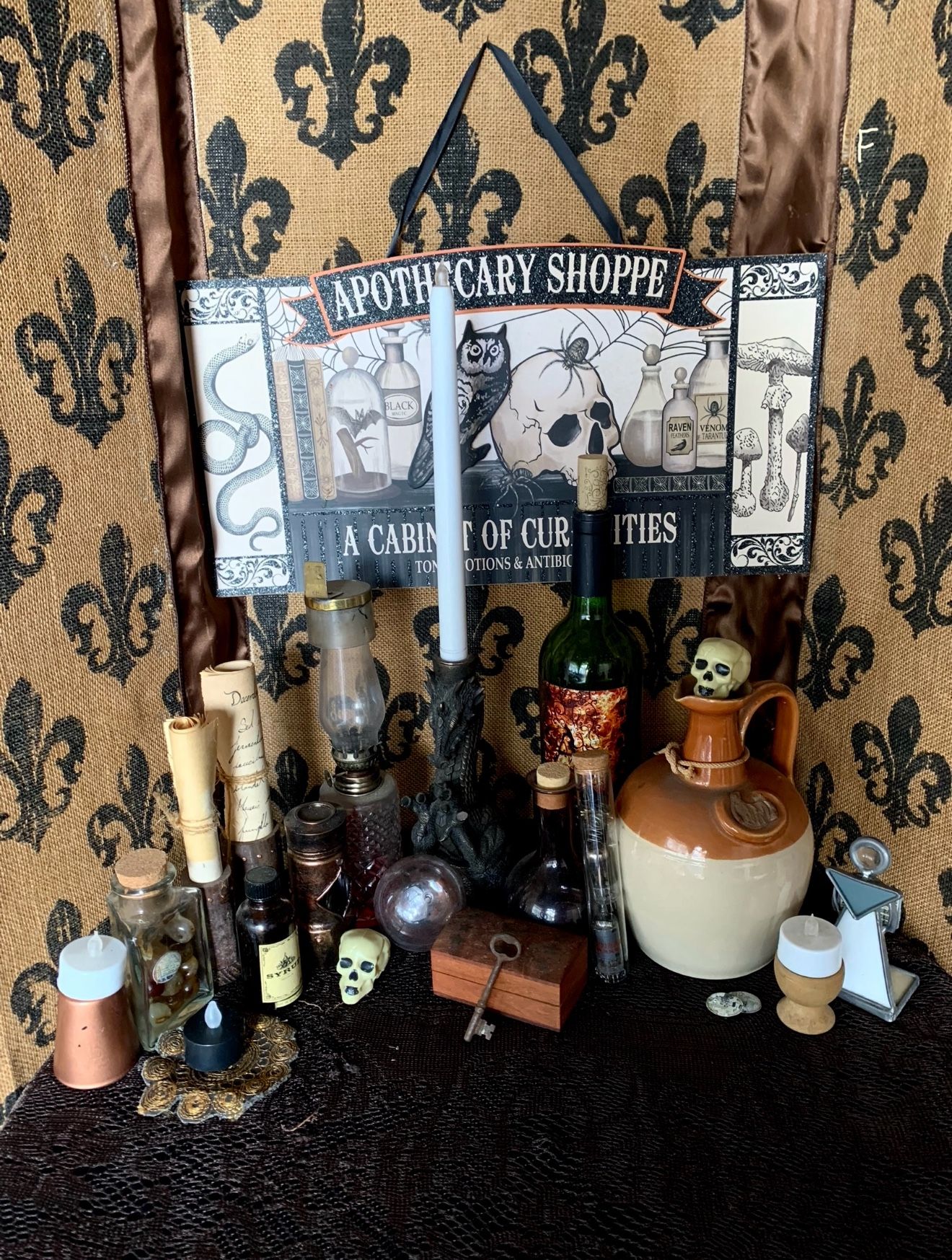 Step into the shadows of Victorian curiosity with these curated Steampunk Apothecary Sets. Each Steampunk Apothecary display is a one-of-a-kind composition—an artful blend of brass, glass, and forgotten curiosities arranged so no two displays are ever alike. Every piece is a story in itself, evoking the creativity of a Victorian inventor’s desk or the mystery of an alchemist’s hidden chamber. Whether it’s the flicker of candlelight glinting off glass vials or the whispered suggestion of an alchemist’s secret recipe, these pieces create an atmosphere that is equal parts eerie and elegant. Perfect for Halloween gatherings, themed parties, or an unforgettable October wedding reception, these displays invite your guests into a world of imagination and wonder. Style them as hauntingly beautiful centerpieces, scatter them across tables for a sense of discovery, or place them on a mantel to spark conversation. With their balance of industrial grit and old-world charm, they’re not just décor—they’re an immersive experience. Set F includes everything seen in the photos except the backdrop and table drape. See my profile for other available sets.