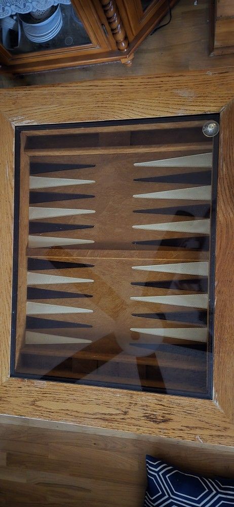 Vintage backgammon table. 30 inches wide 25 inches deep 29 inches high Has a removable glass top. Has some scuffs and scratches. Does not come with the playing pieces.
