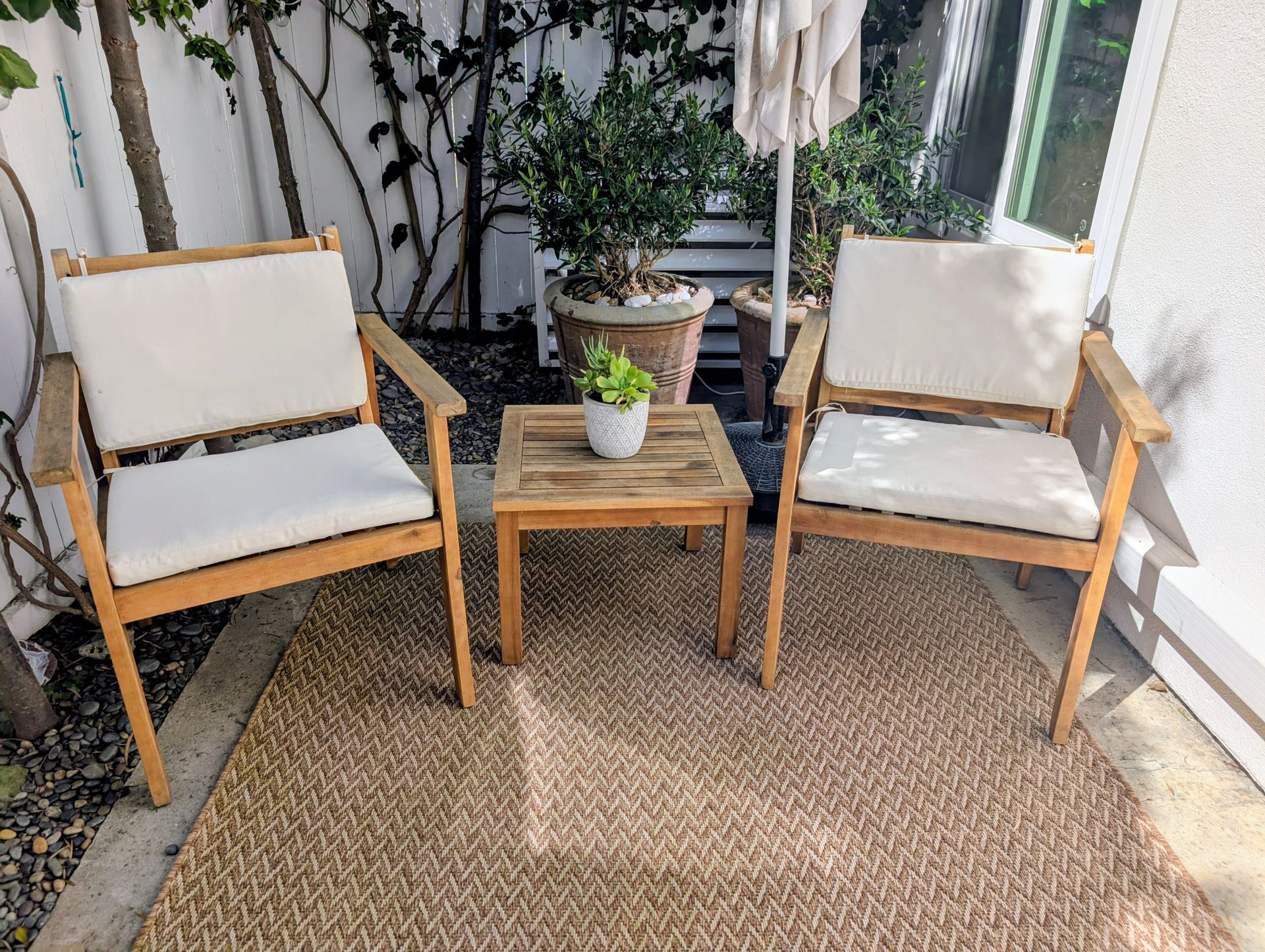 Great condition with clean neutral cushions. Perfect for small patio or balcony.