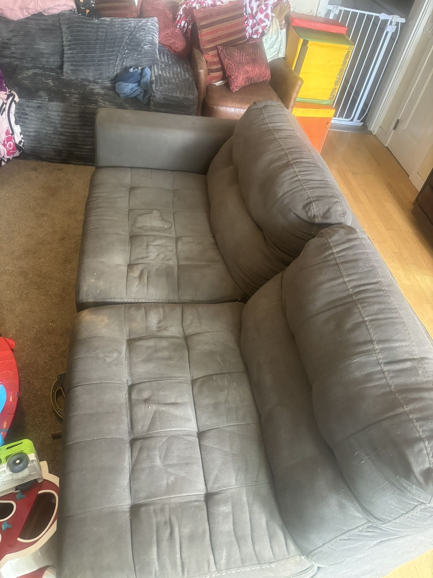 *MUST BE ABLE TO PICK UP BY 8pm MONDAY 9/23* FREE SECTIONAL -MUST BE ABLE TO LIFT AND HAUL AWAY - PET AND KID FRIENDLY HOME HAD COUCH COVER AND PILLOWS ON IT THE DURATION OF TIME I HAD IT -slight dip in one end of the couch . We just used pillows to accommodate
