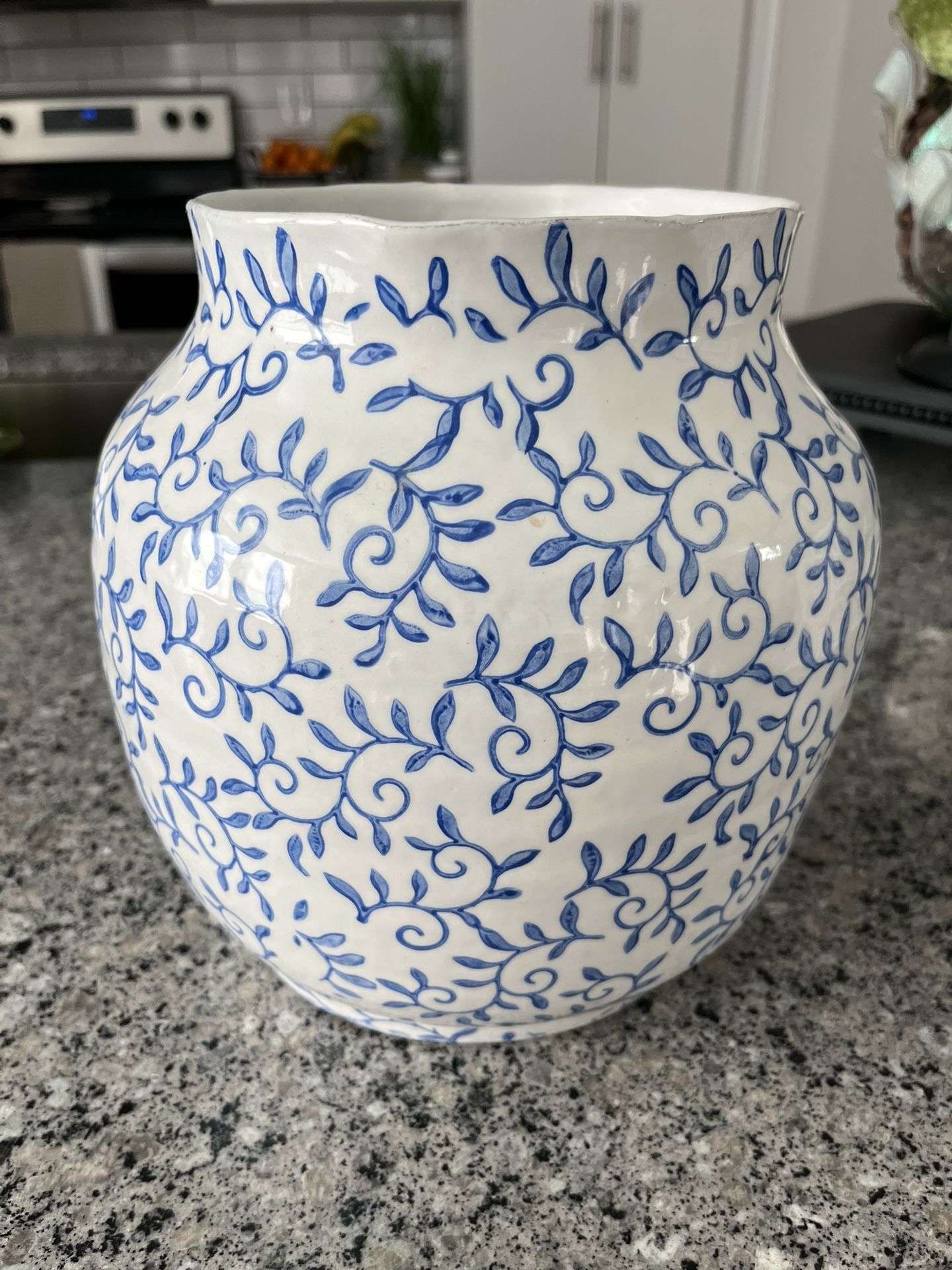 Blue and white design vase. Natural curved opening. 27.5” at widest point, ht: 8.75”, opening : 5.5”. No cracks or chips.
