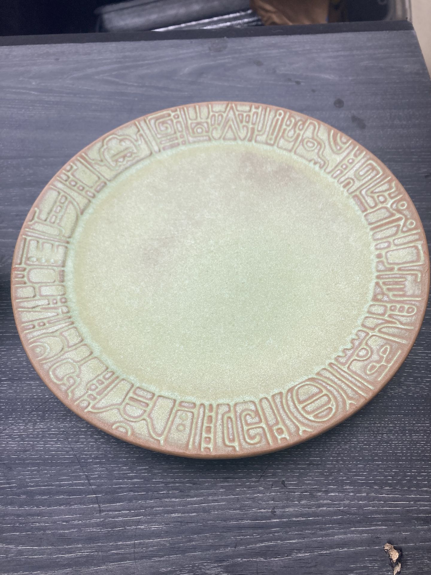 Six Frankoma 7FH dinner plate 10” and three coffee cups 7C. One plate and one cup have nicks in the coloring as shown in the photos. Very unique color and patterns.