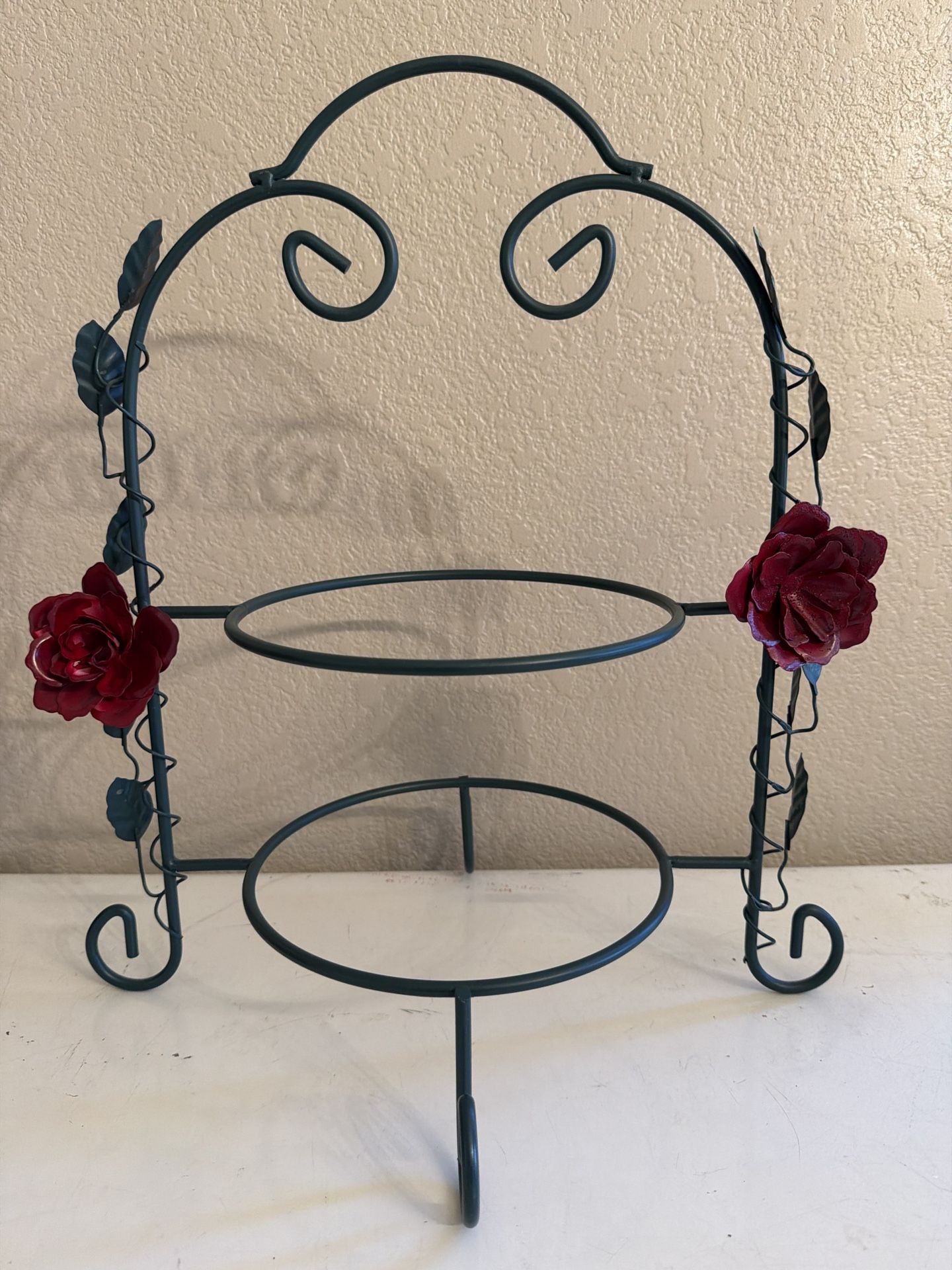 Cute 2-tier metal dessert/serving stand with scrollwork and rose/vine accents. Perfect for cupcakes, cookies, pastries, fruit, or party appetizers. Great for tea parties, bridal/baby showers, spring décor, or cottagecore kitchens. Plates not included. Good preowned condition with minor wear.