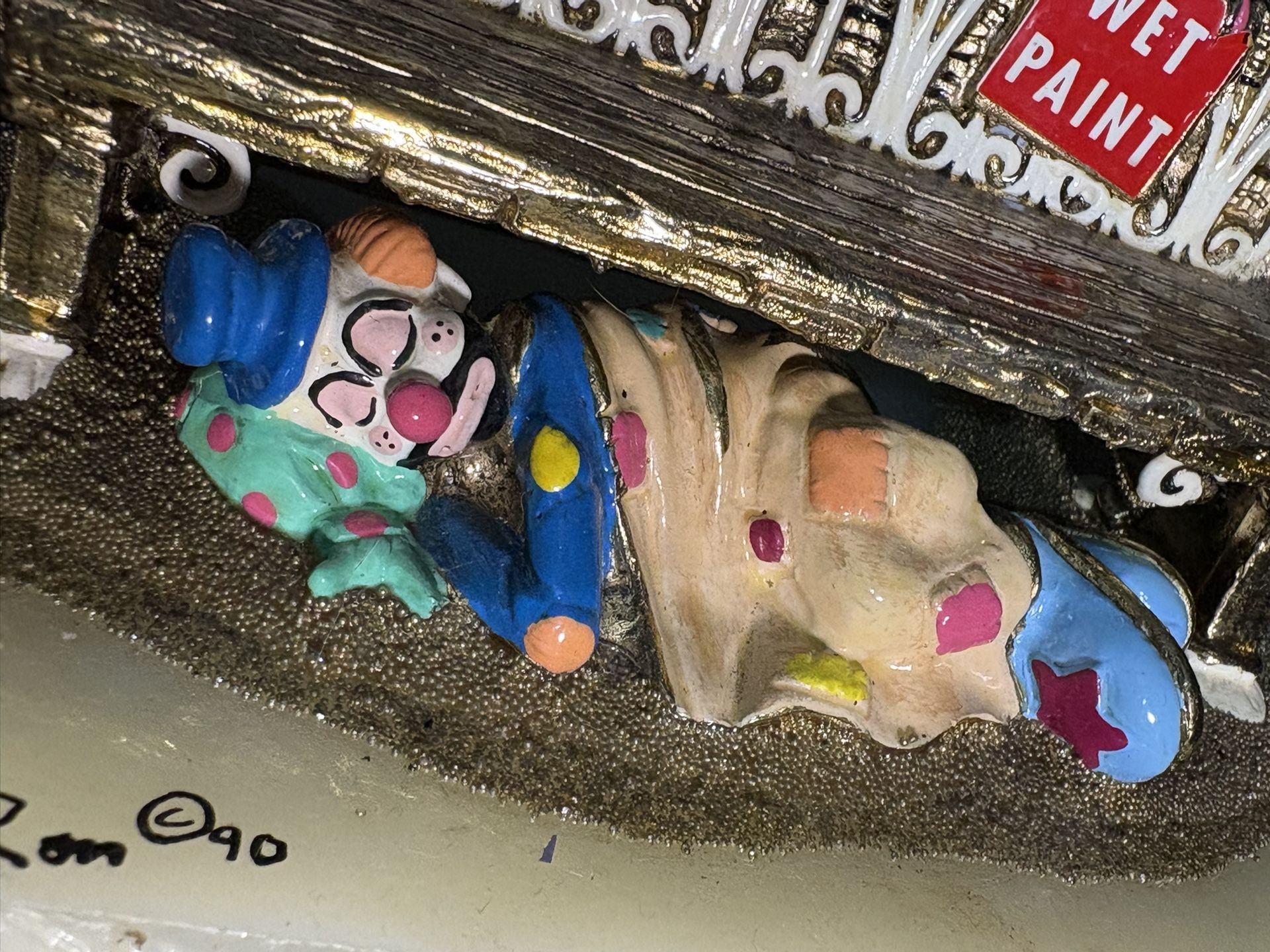 The Ron Lee clowns figurine is a handmade, original piece perfect for any room in your home. This signed figurine features a circus theme and is ideal for all occasions. The unboxed packaging allows for easy display and adds a unique touch to any space. Perfect for collectors or anyone looking to add a whimsical and artistic touch to their decor.