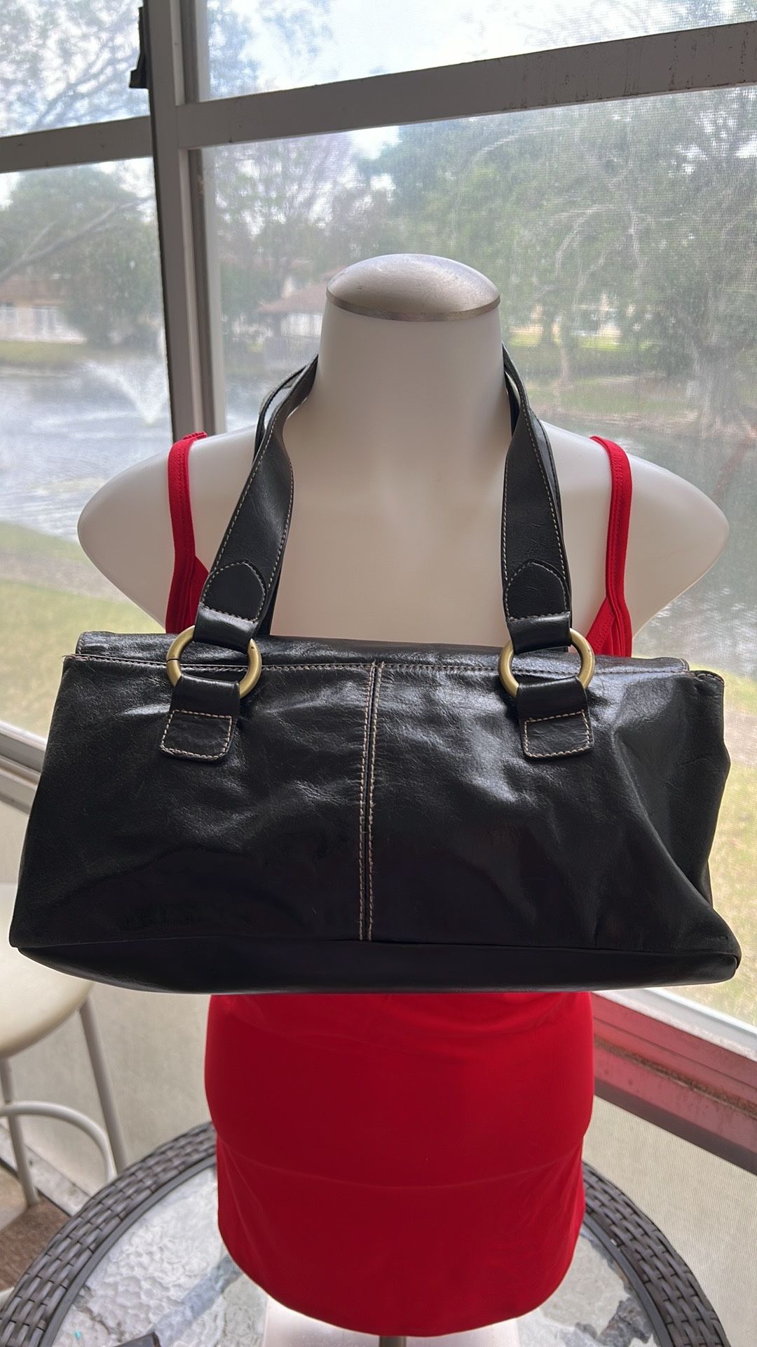 In new condition but it’s. Vintage leather bag Black leather with gold hardware Measures 13” x 6” with absolutely no signs of wear at all