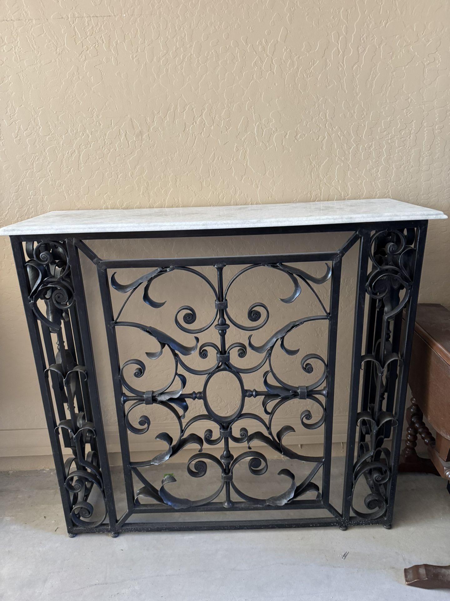 Beautiful marble topped console with decorative iron base. 13”x41”. 37” tall. Marble top is 1” thick with rounded edge. No chips or cracks. Top rests on wrought iron base. Very solid. Could be used inside or out. Original retail $1199