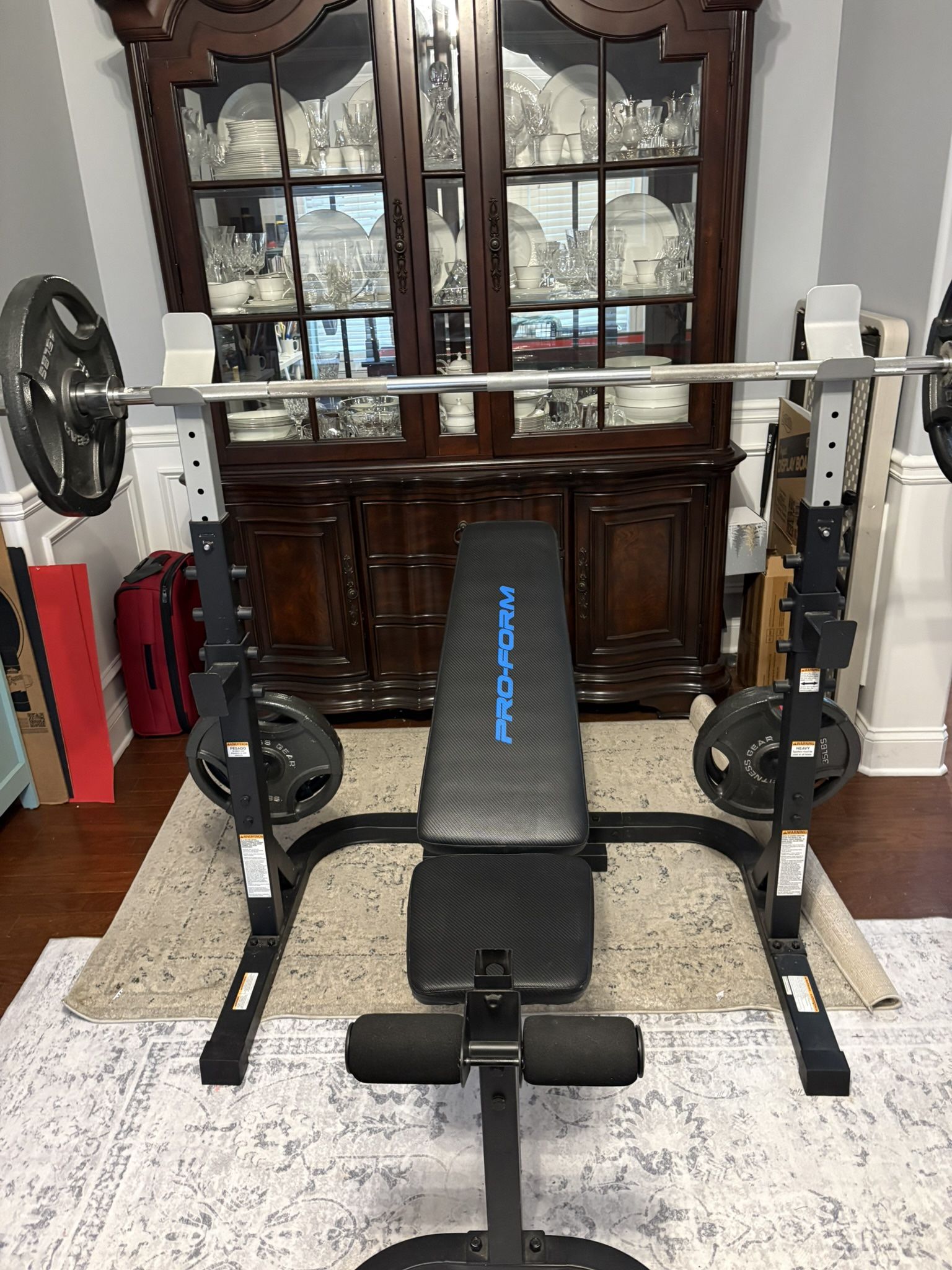 **Bar and weights are not included** Pro-Form Olympic Bench Press Set, in good condition. Includes the rack, bench, safety arms, and leg extension/preacher curl attachments.