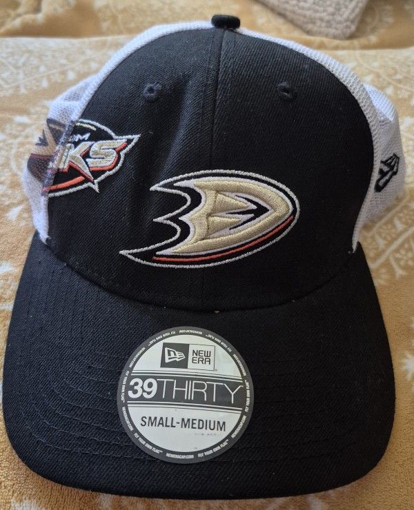 Anaheim Ducks New Era 39THIRTY stretch-fit cap. This is an officially licensed NHL product with the holographic authenticity sticker and original price tags still attached. Brand: New Era 39THIRTY Size: Small-Medium (Stretch Fit) Like New Structured crown, curved brim, and high-quality embroidered Ducks logo. Breathable white mesh back panels (Trucker style). Authenticity: Includes the numbered NHL holographic sticker on the underside of the brim. Great for any Ducks fan or collector. Clean, smoke-free home.