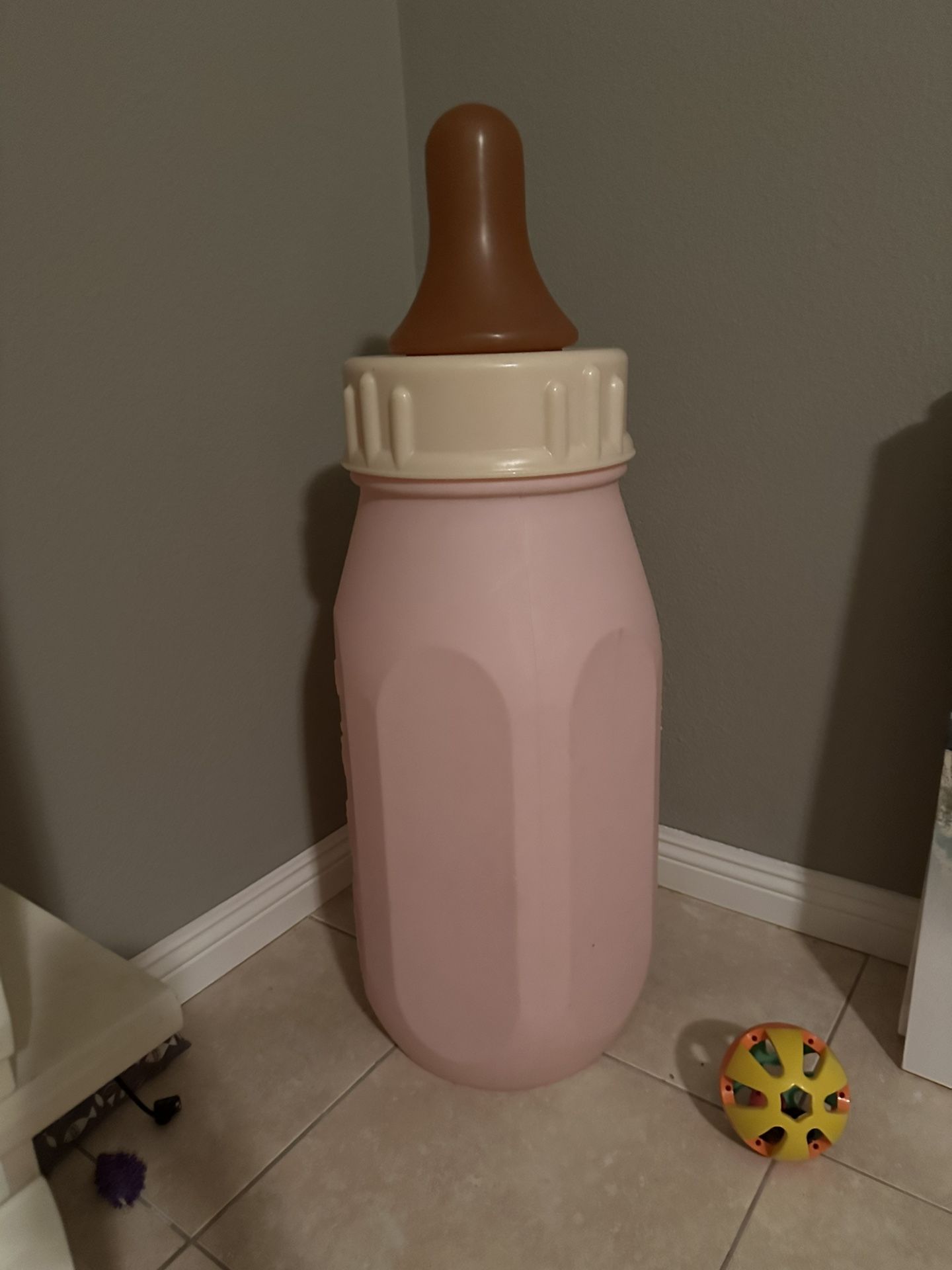 Giant 42” tall pink plastic baby bottle decoration. Hollow in the middle allowing for storage. The cap lifts off to expose the inside of the bottle. ~16” wide. Good condition. $20 obo