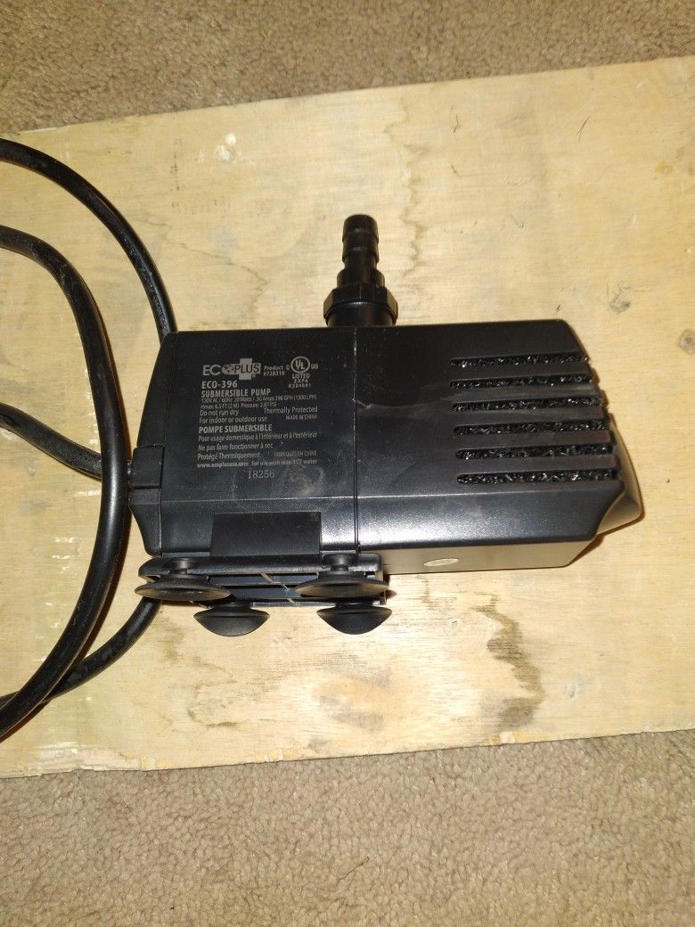 ECOPLUS submersible water pump •MODEL -- ECO-396 •VOLTAGE -- 120V •AMPS -- .30 AMPS •GPH --396 •PRESSURE -- 2.87 PSI THERMALLY PROTECTED