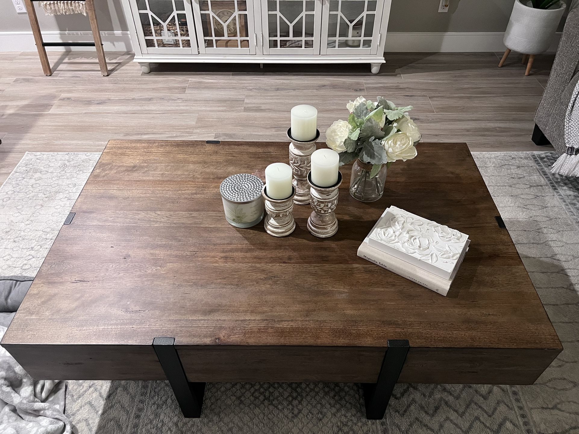 Beautiful wood and black metal coffee table, great condition, no dents or scratches. Ready for pick up. Matching side/end table available as well $250 for table $100 for end table OBO couches and rug available as well