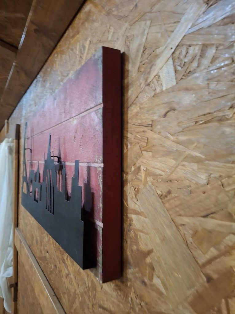 Red wooden board with Skyline madenof iron must pick up in new albany